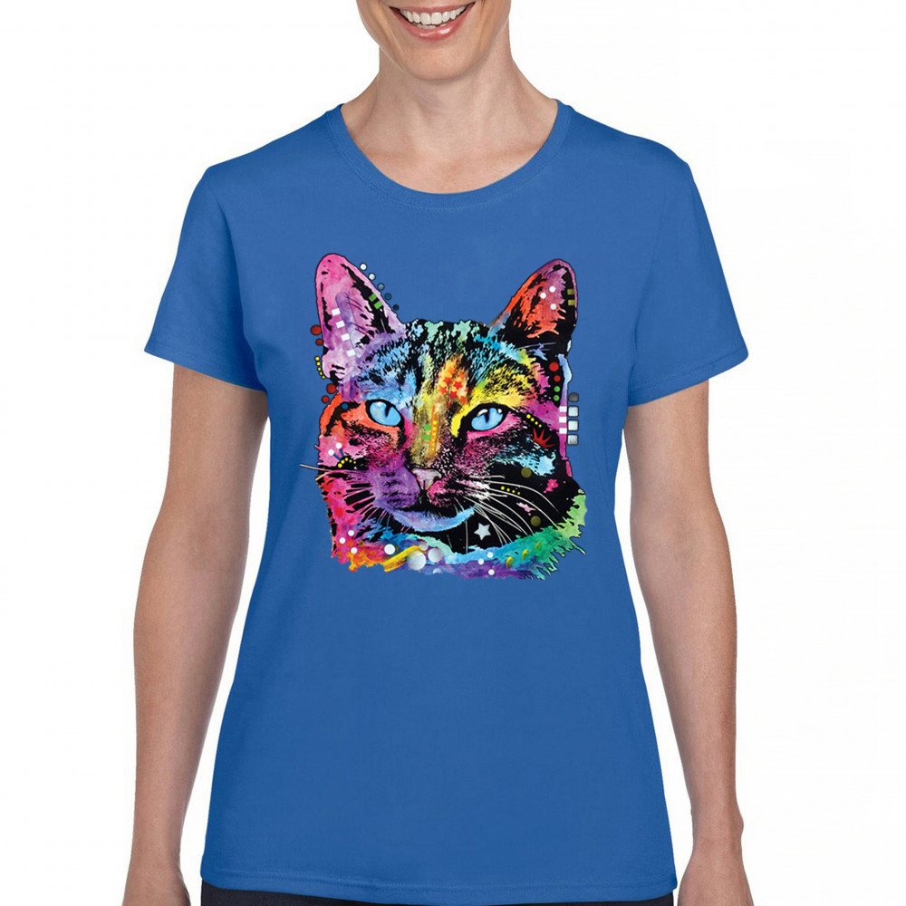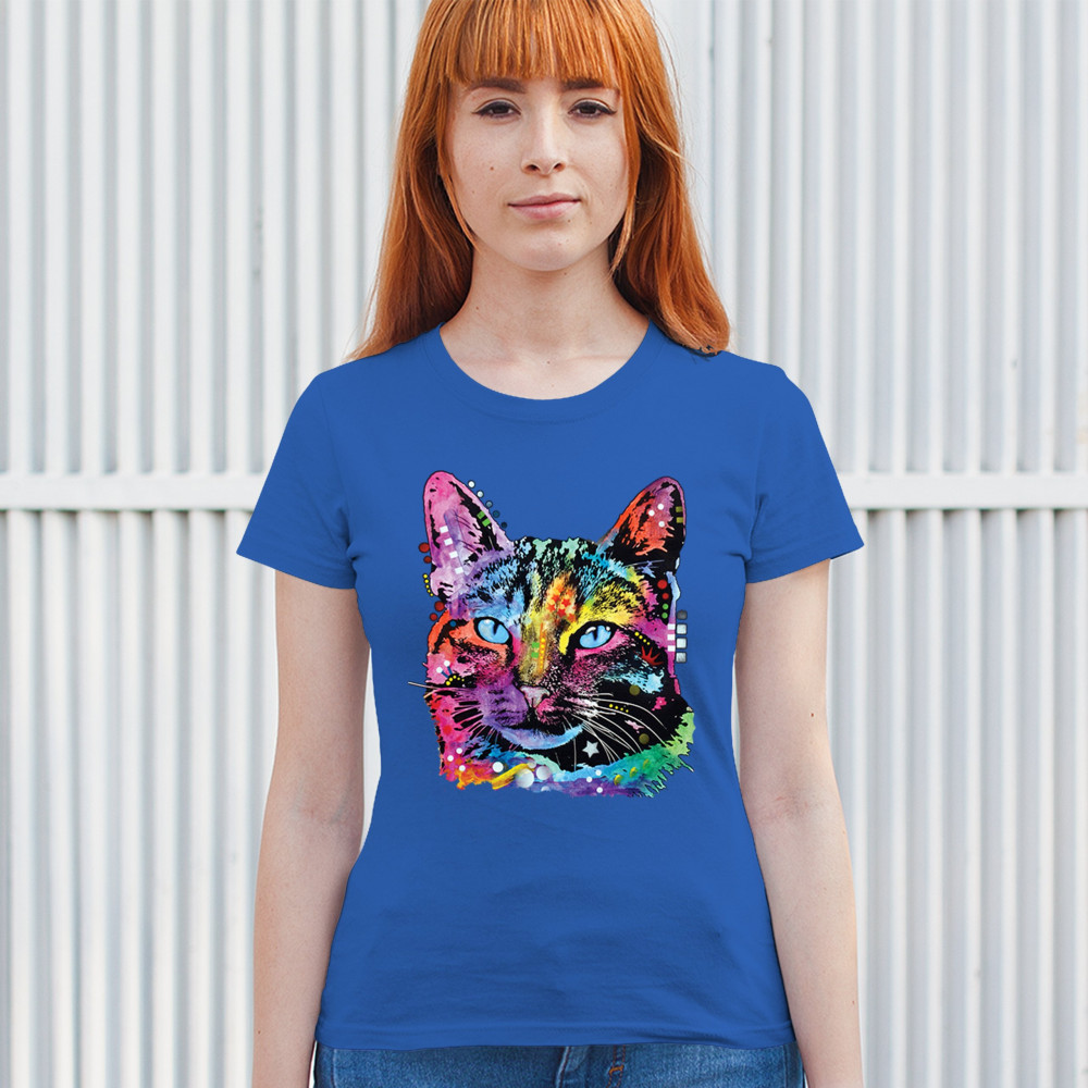 DEAN RUSSO THOUGHTFUL CAT t-shirt colorful pet kitten eyes women's tee royal blue
