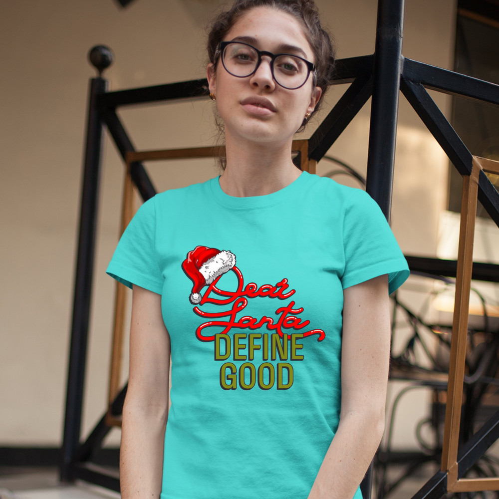 A print saying: "Dear Santa define good". There is a Santa's hat on the letter "D". Amazing choice to make people smile and spread positive vibes on Christmas Eve.
