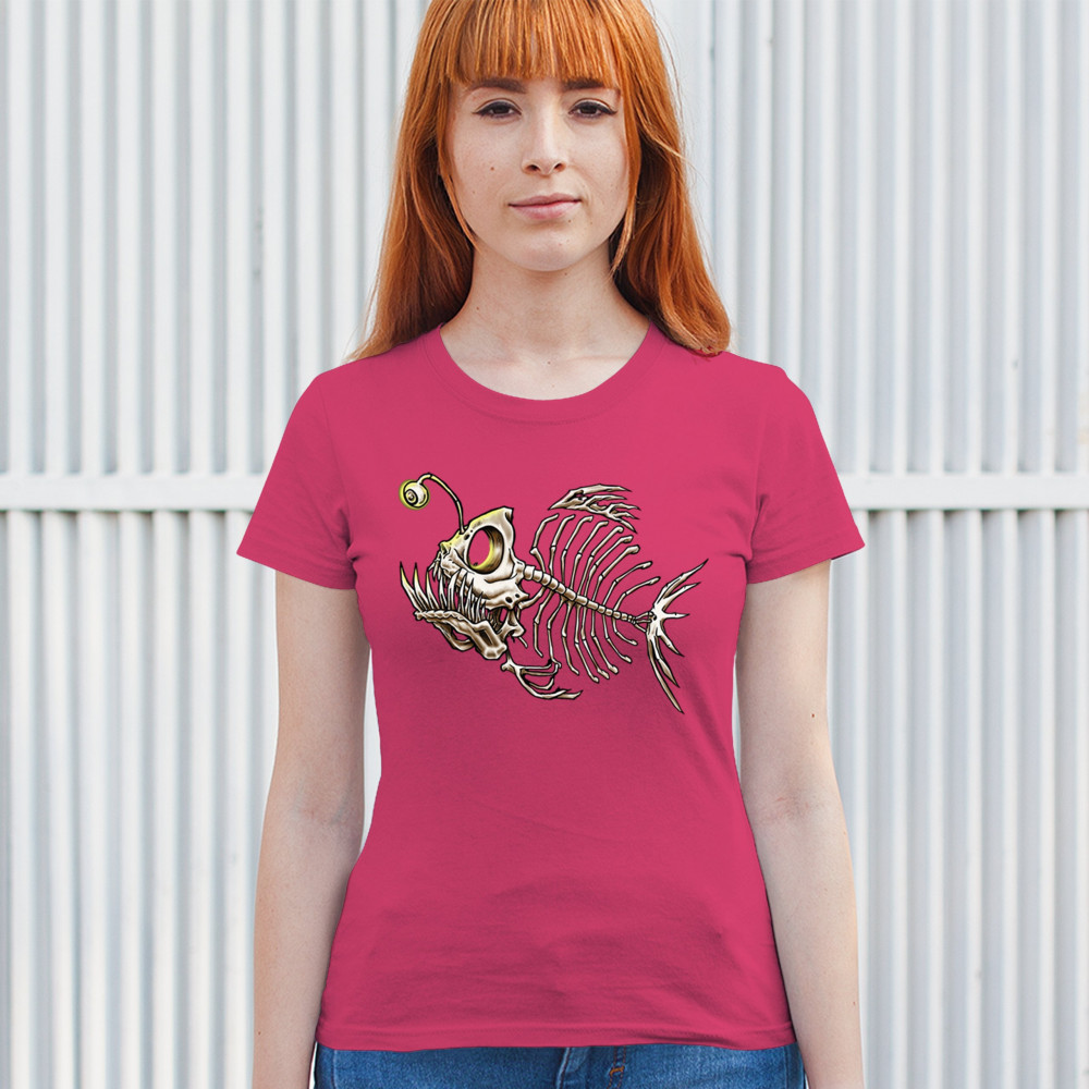 This highly detailed angler fish skeleton design features sharp bones, glowing lure eye, and deep sea terror aesthetic. Perfect for horror fans, marine biology lovers, and ocean adventurers, it combines underwater predator vibes with bone art flair. A great fit for Halloween, dive clubs, and dark sea aesthetics.