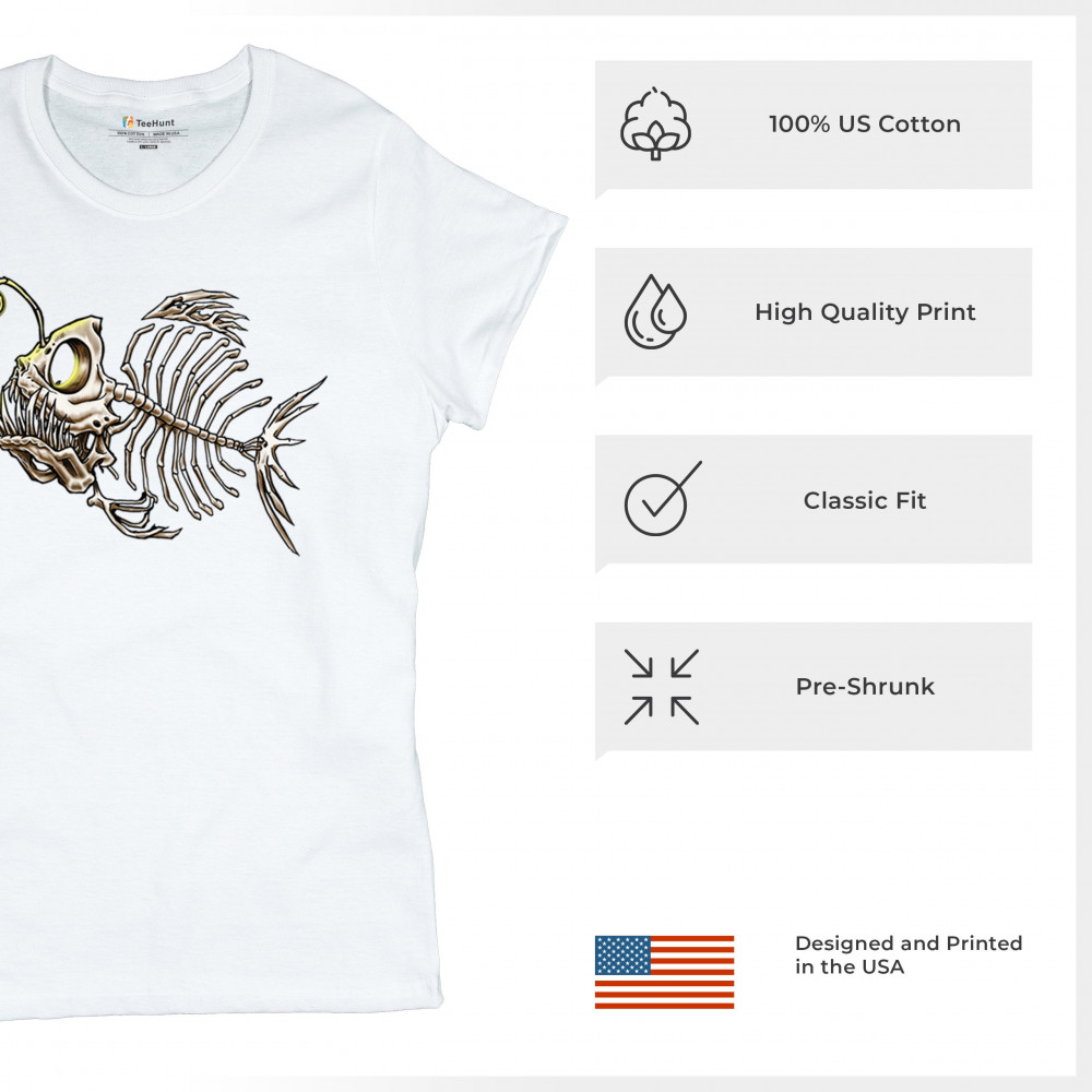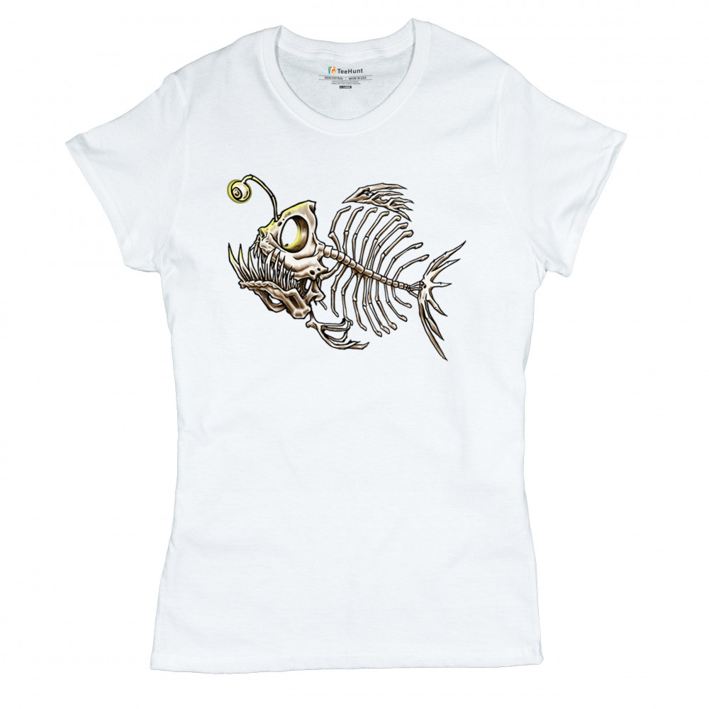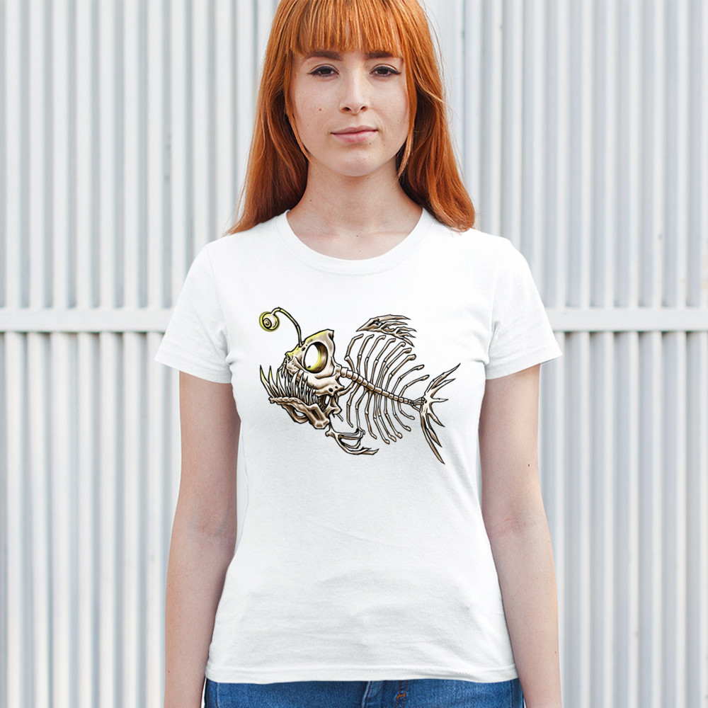 This highly detailed angler fish skeleton design features sharp bones, glowing lure eye, and deep sea terror aesthetic. Perfect for horror fans, marine biology lovers, and ocean adventurers, it combines underwater predator vibes with bone art flair. A great fit for Halloween, dive clubs, and dark sea aesthetics.