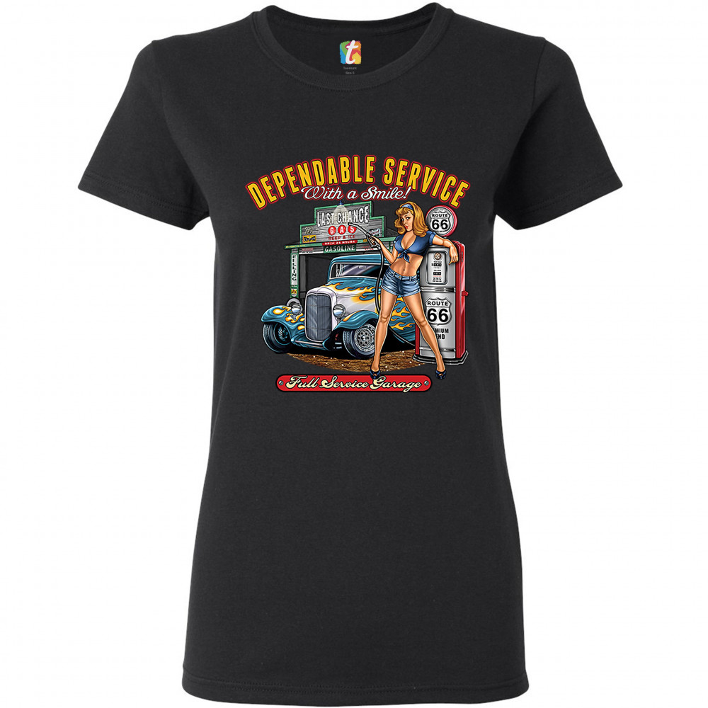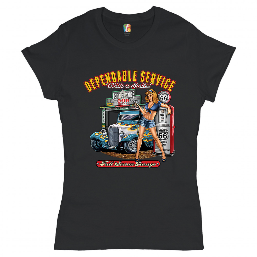 A print featuring a sexy pin-up girl standing by a gas pump with Route 66 signs on it. Behind her there is a garage with a hot rod parked at it. The print says: "Dependable Service With a Smile!" at the top and "Full Service Garage" at the bottom. A great