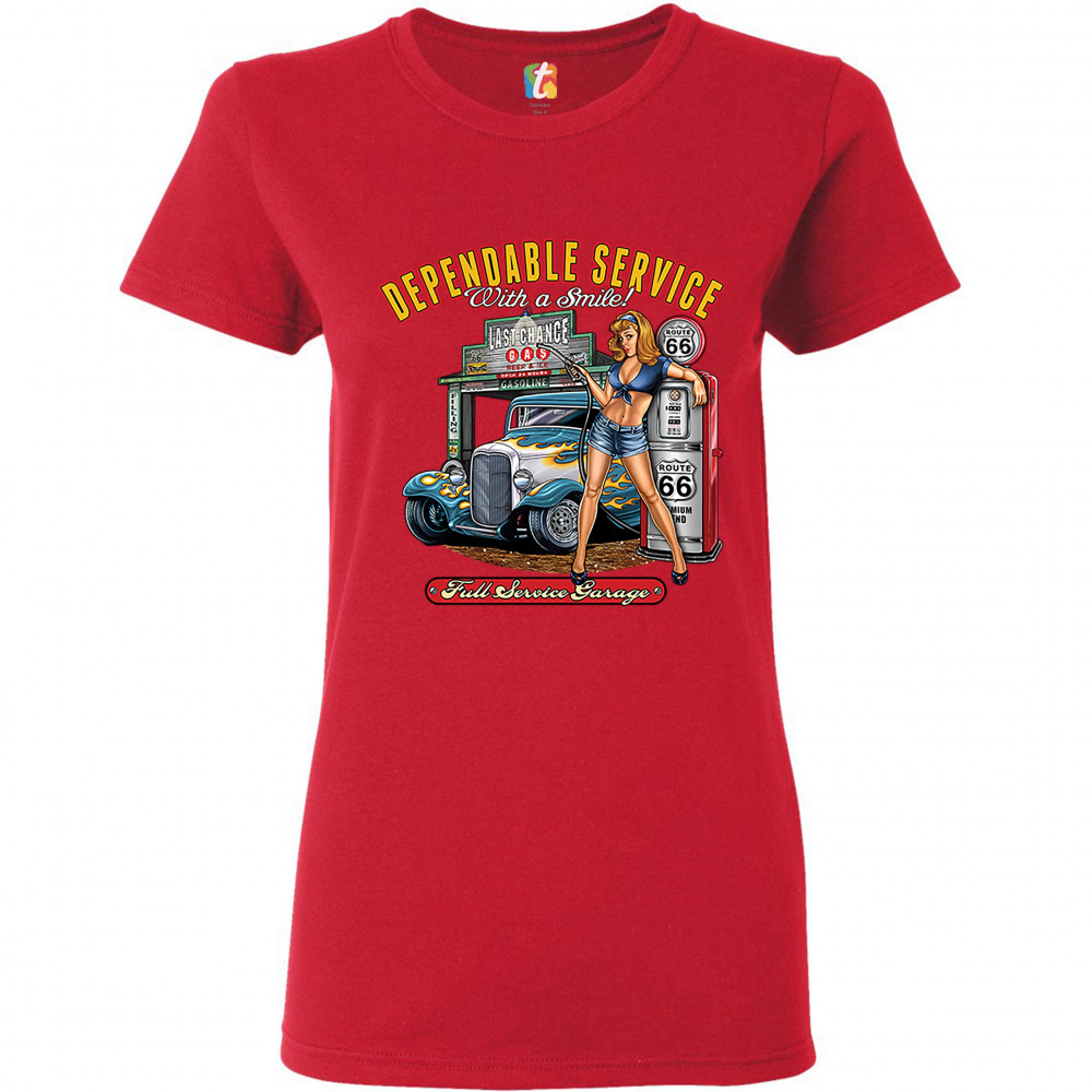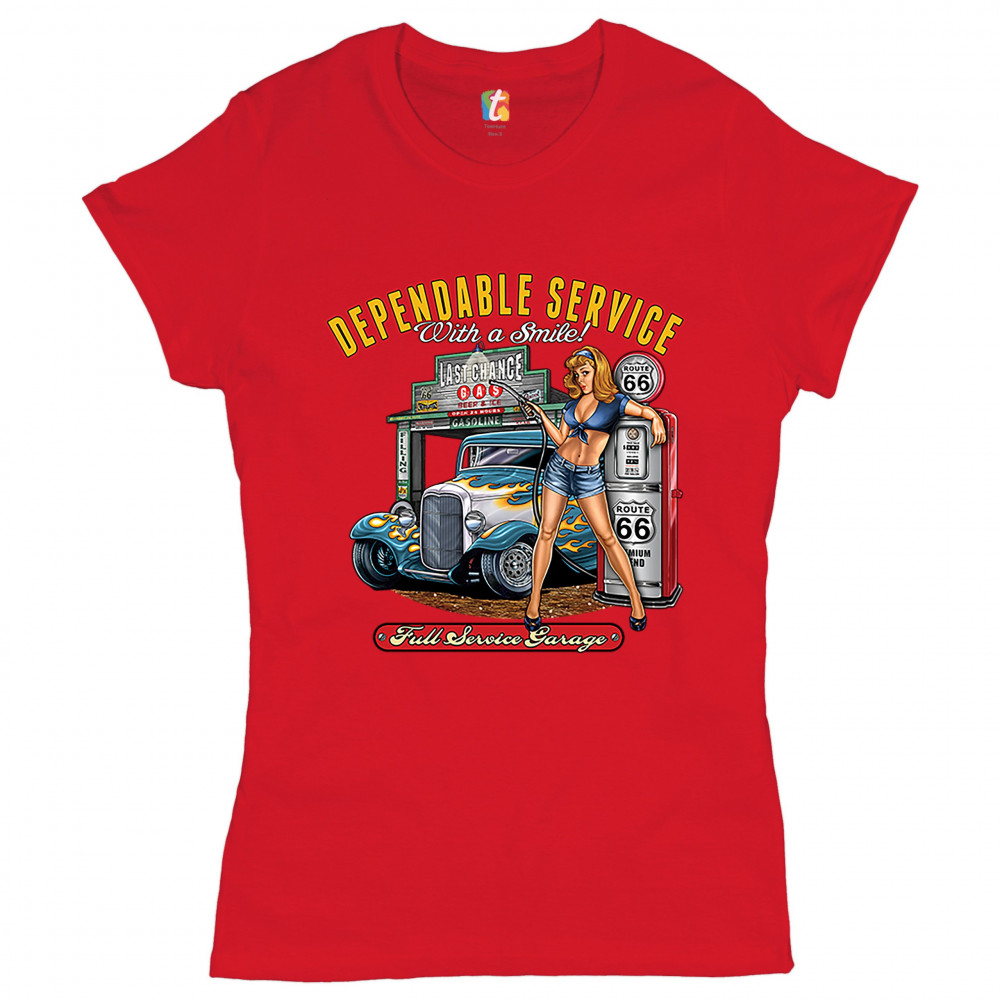 A print featuring a sexy pin-up girl standing by a gas pump with Route 66 signs on it. Behind her there is a garage with a hot rod parked at it. The print says: "Dependable Service With a Smile!" at the top and "Full Service Garage" at the bottom. A great