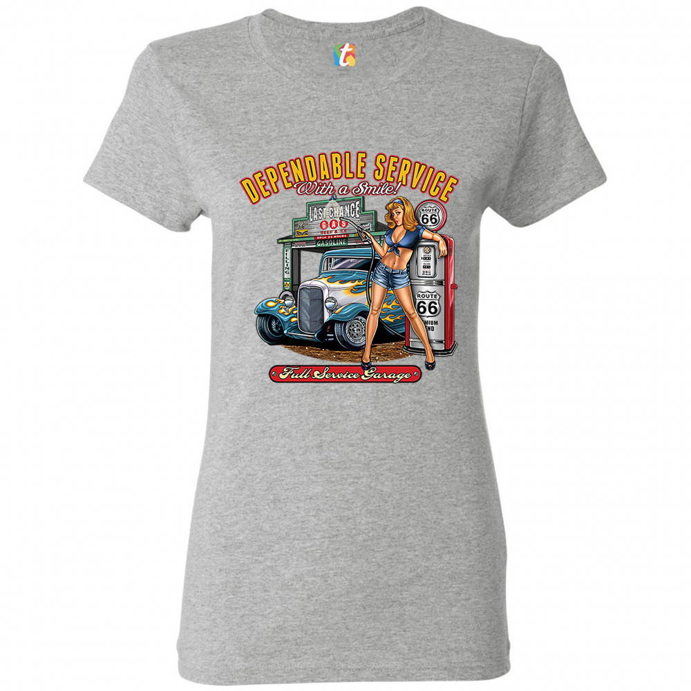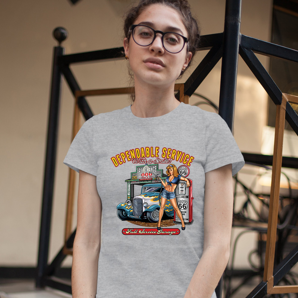 A print featuring a sexy pin-up girl standing by a gas pump with Route 66 signs on it. Behind her there is a garage with a hot rod parked at it. The print says: "Dependable Service With a Smile!" at the top and "Full Service Garage" at the bottom. A great