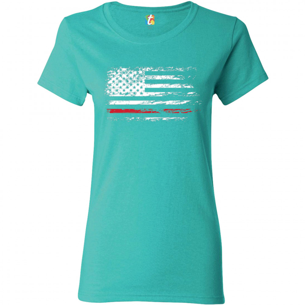 DISTRESSED AMERICAN FLAG t-shirt thind red line firefighter women's tee light blue