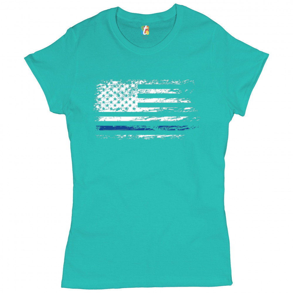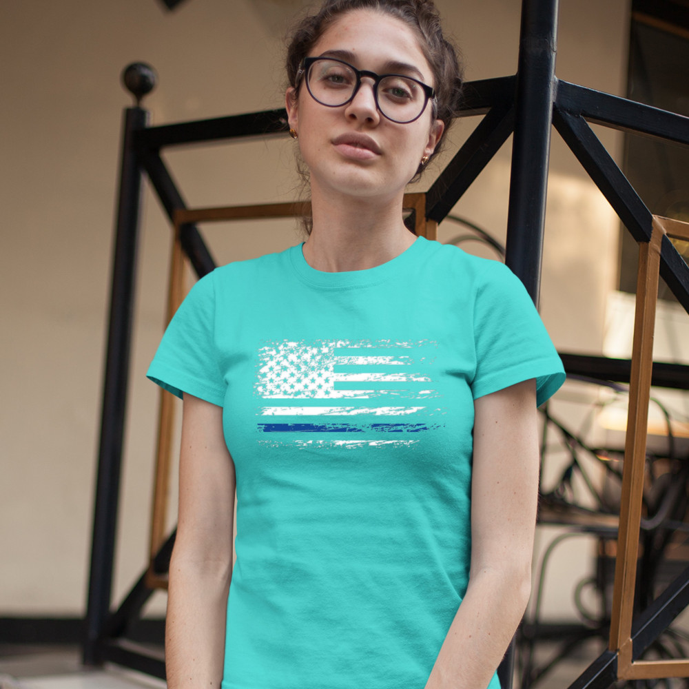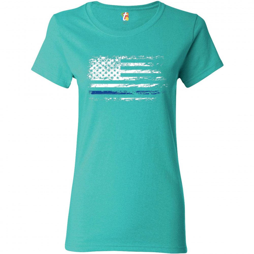 DISTRESSED THIN BLUE LINE AMERICAN FLAG t-shirt patriotic police women's tee light blue