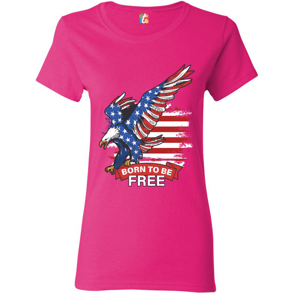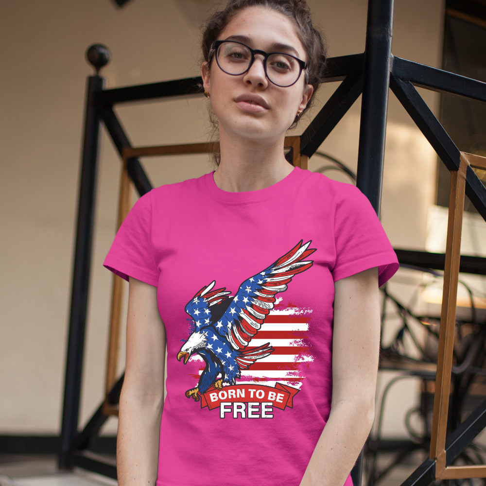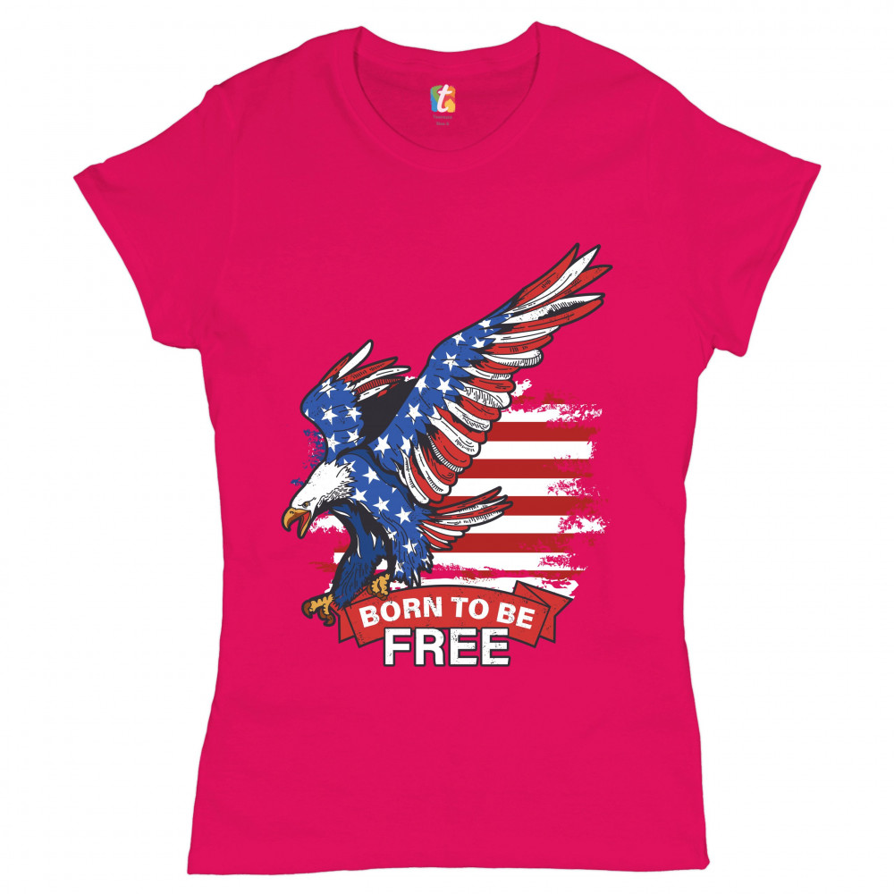 A patriotic print saying "Born to Be Free" and featuring a diving American Bald Eagle. In the background there is a distressed American Flag and the eagle is covered with Stars and Stripes. Great choice to wear on Independence Day or any other patriotic h