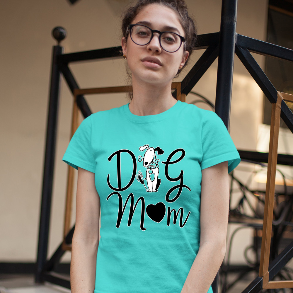 A sweet print saying: "Dog Mom". Instead of "o" in "dog" there is a cute dog holding a bone in it's jaws. And instead of the "o" in "mom" there is a heart. A great choice for any dog person.