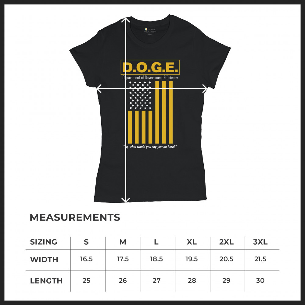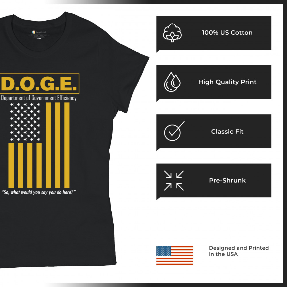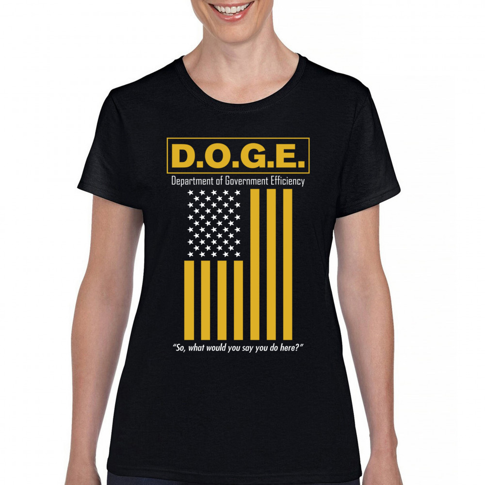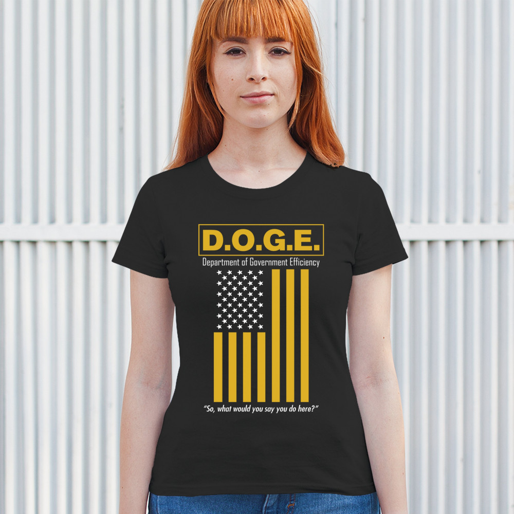 The D.O.G.E. Department of Government Efficiency design features bold yellow lettering and a sarcastic punchline aimed at bloated systems. Clean typography paired with a reimagined American flag gives this political parody retro appeal. Ideal for libertarians, patriots, or anyone fed up with inefficiency and red tape.