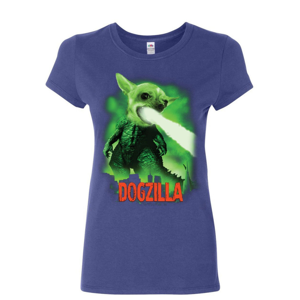 DOGZILLA FUNNY women's t-shirt movie parody dog pet lovers atomic breath shirt blue