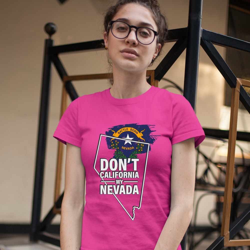 A political print featuring a silhouette of the state of Nevada and it's flag on the inside. The print says: "Don't California my Nevada". A great choice for anyone who is concerned for a huge number of Californians moving to their beloved state.
