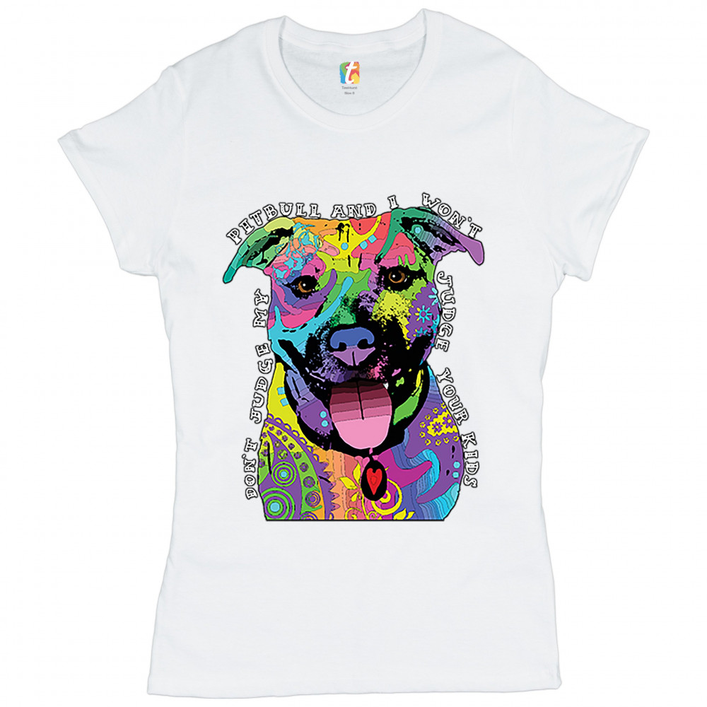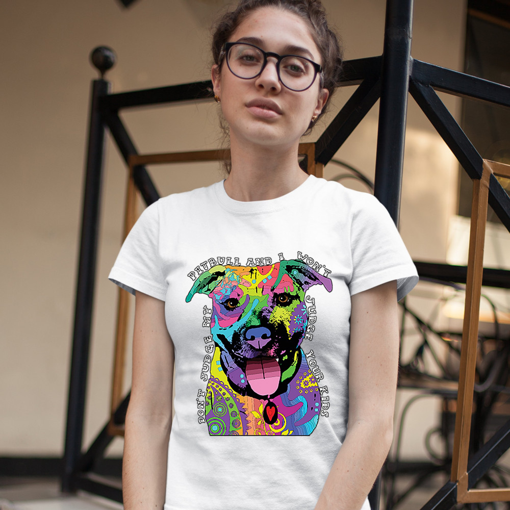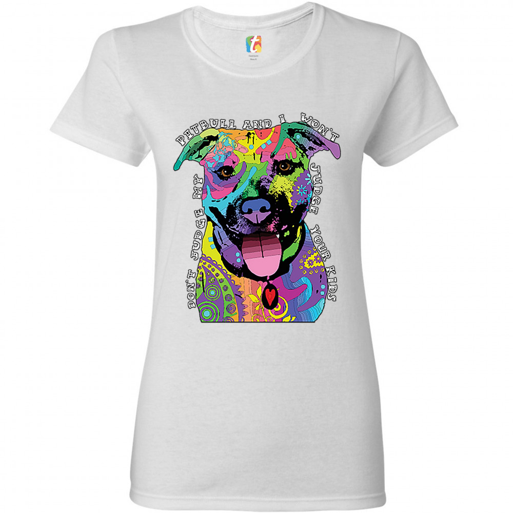 DON'T JUDGE MY PIT BULL t-shirt funny andy maxx dog lover pet owner women's tee white