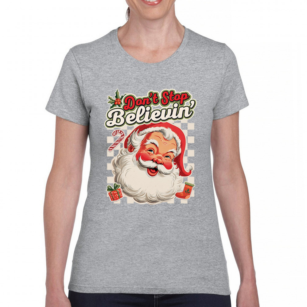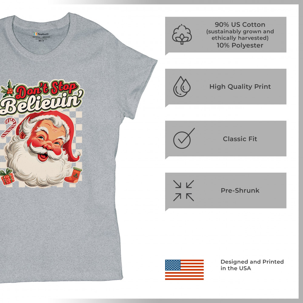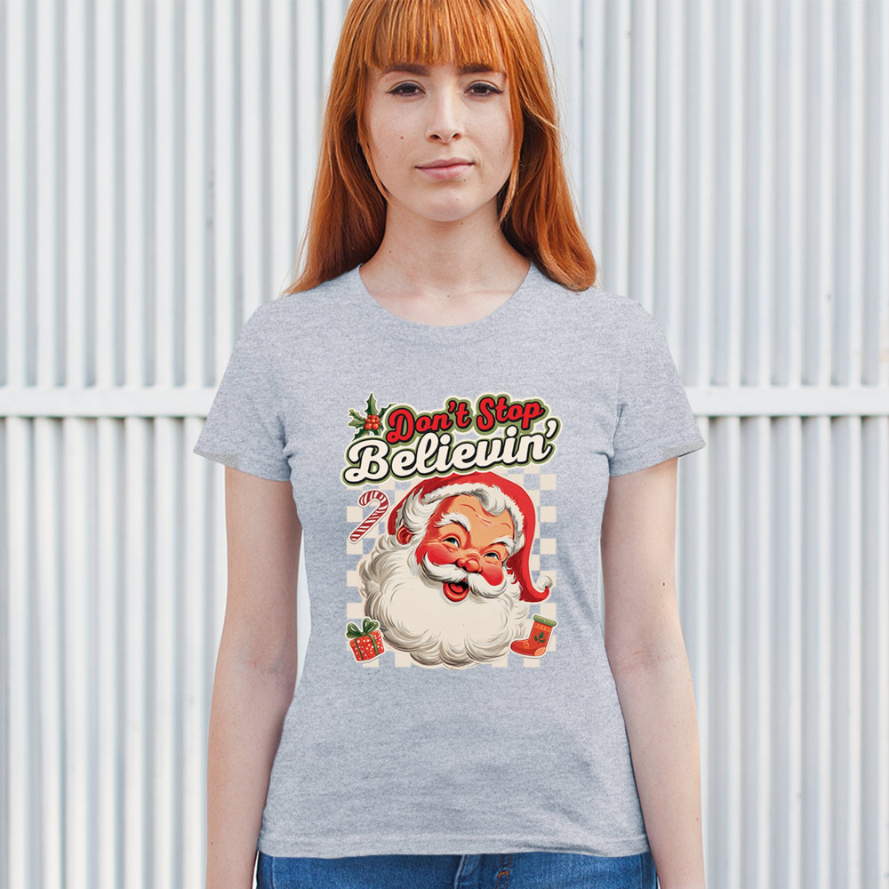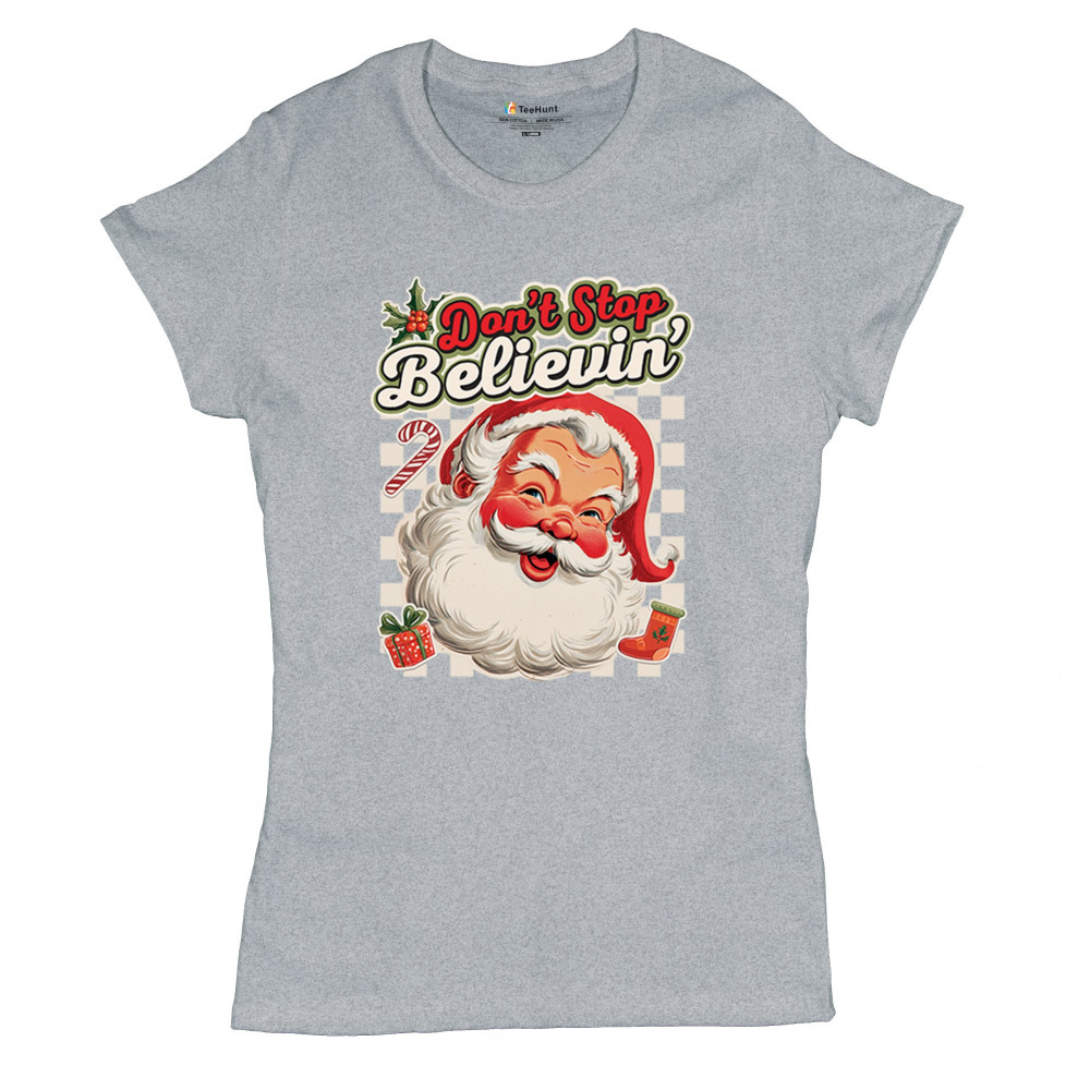 Spread holiday cheer with this “Don’t Stop Believing†Santa Claus shirt that blends classic Christmas spirit with cozy winter charm. Perfect for festive parties, family gatherings, or relaxing by the fire, this design captures Jingle Bells joy, Merry Xmas fun, Santa Claus magic, Reindeer delight, Rudolph glow, Snowman charm, and Christmas tree style for the perfect seasonal outfit.