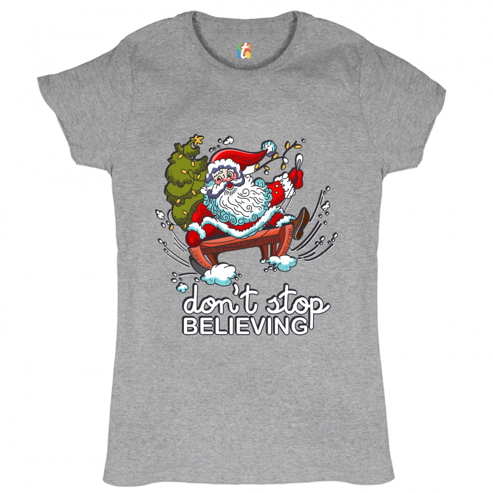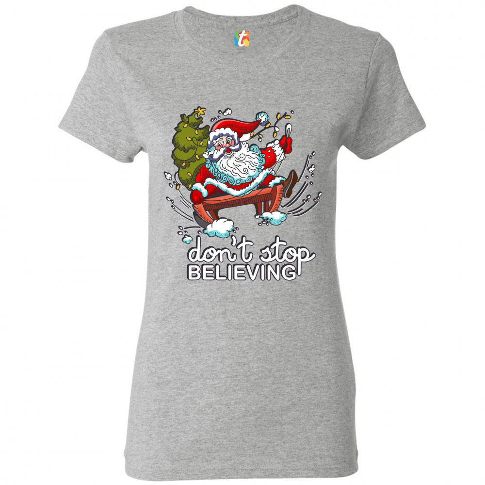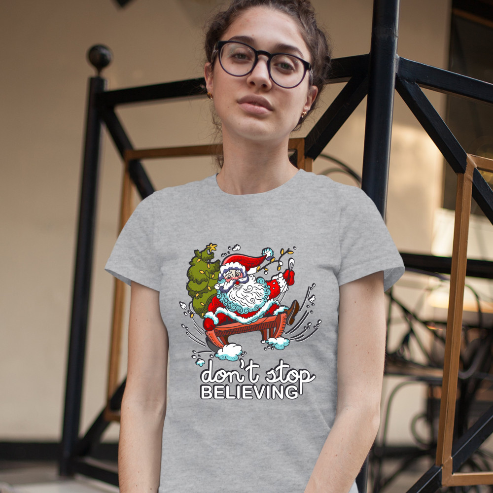 DON'T STOP BELIEVING t-shirt christmas holiday spirit santa claus women's tee gray