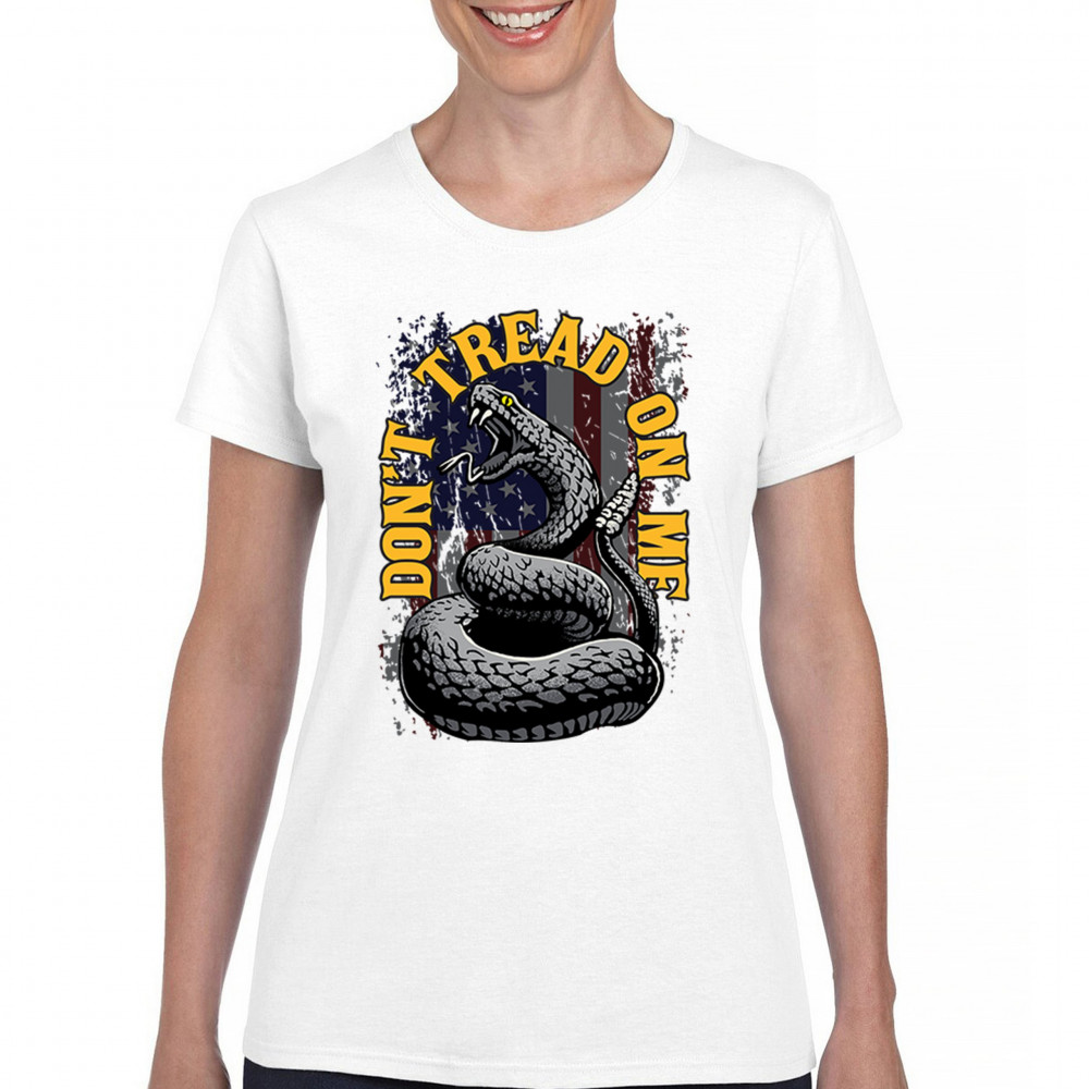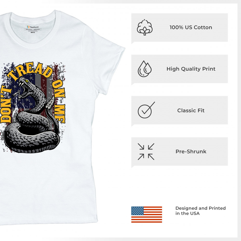 Bold "Don't Tread on Me" design with snake and American flag. Ideal for patriots. Show your love for freedom and independence.