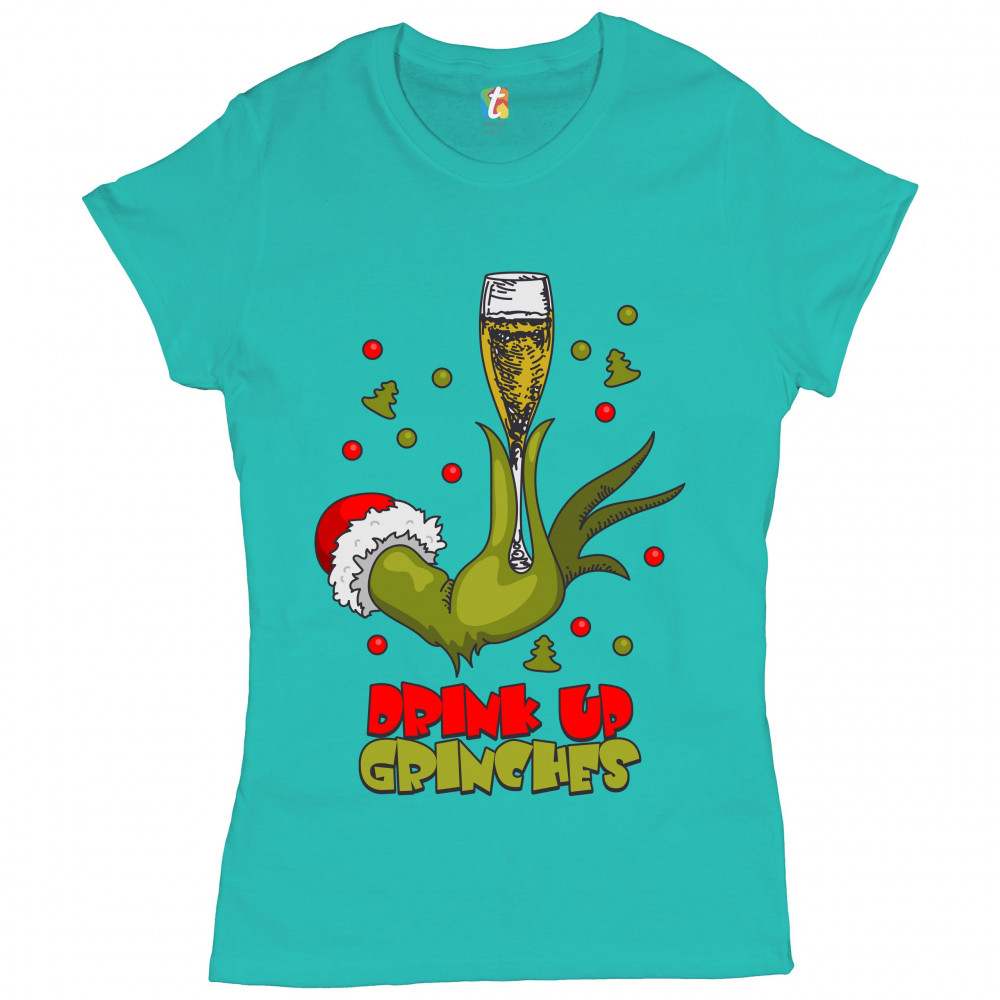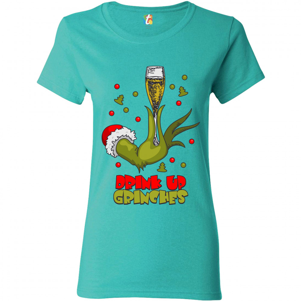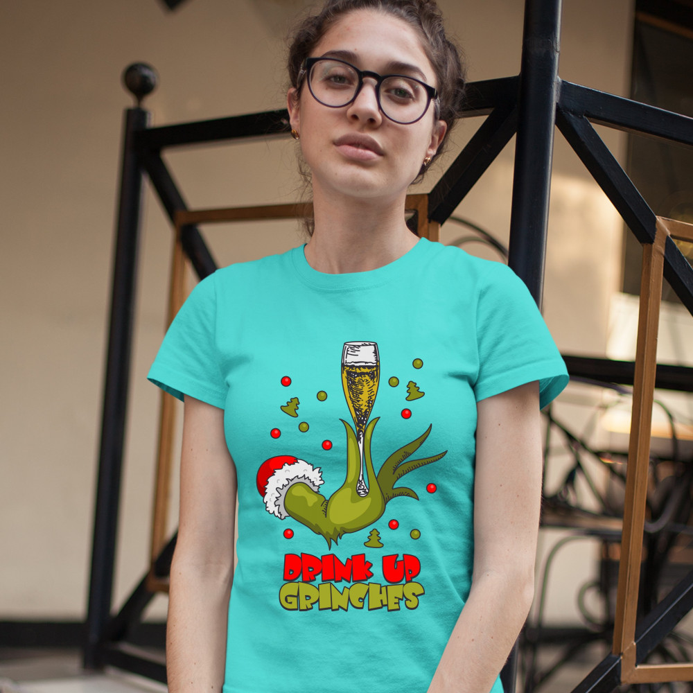 DRINK UP GRINCHES t-shirt funny christmas drinking women's tee light blue