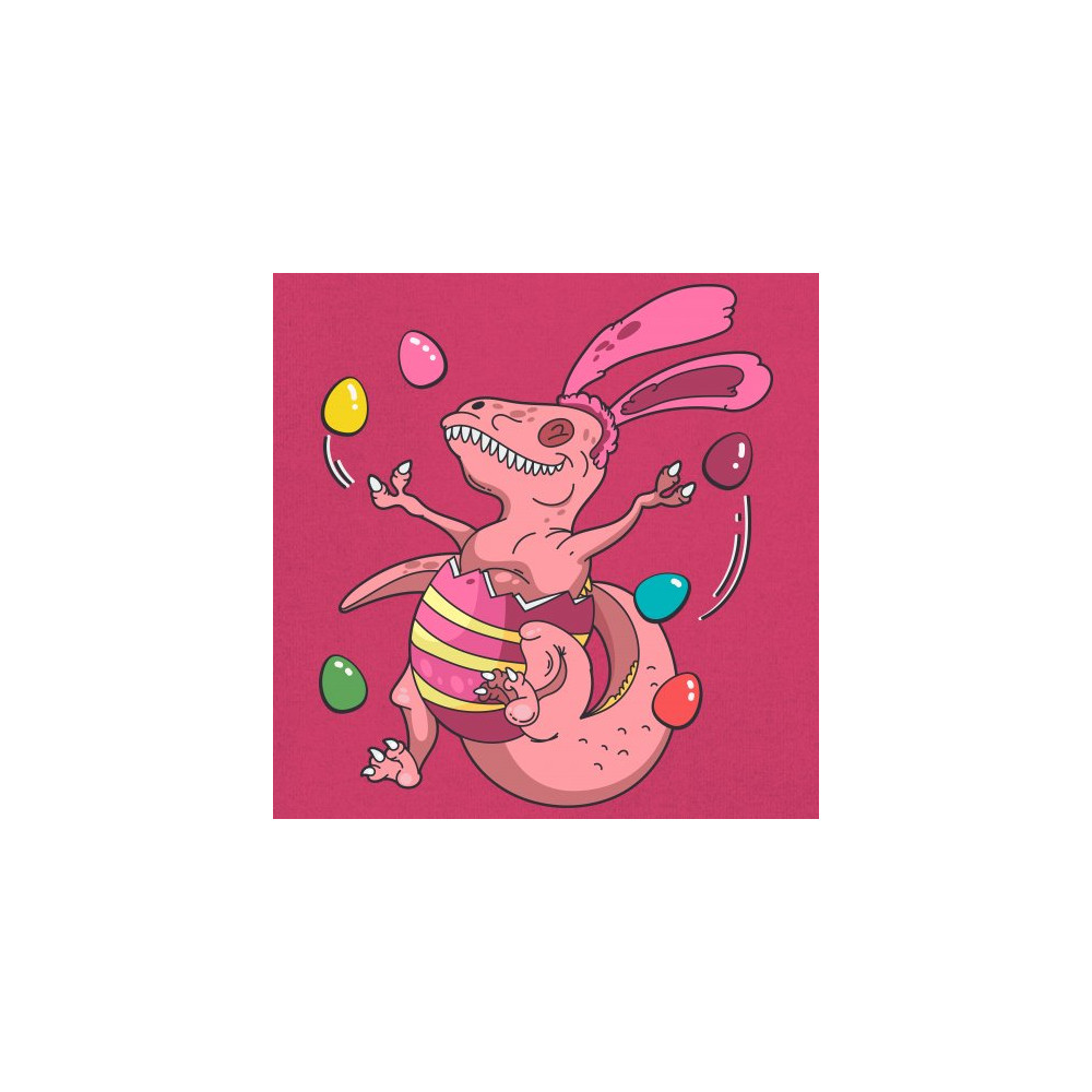 A print displaying a pink Tyrannosaurus Rex with rabbit ears hatching from an Easter egg surrounded by smaller eggs. A great gift for a religious person for Easter, Christmas or any other religious holiday.