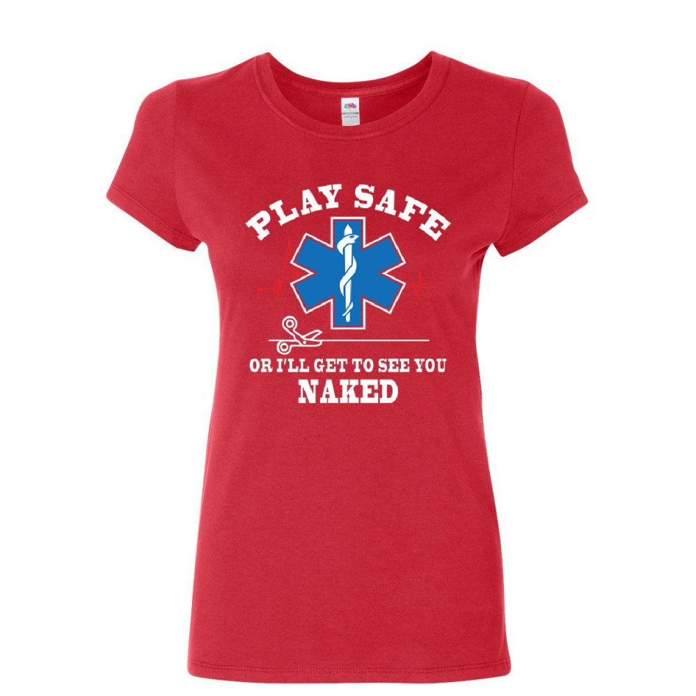 EMS PLAY SAFE OR I'LL GET TO SEE YOU NAKED women's t-shirt paramedic shirt red