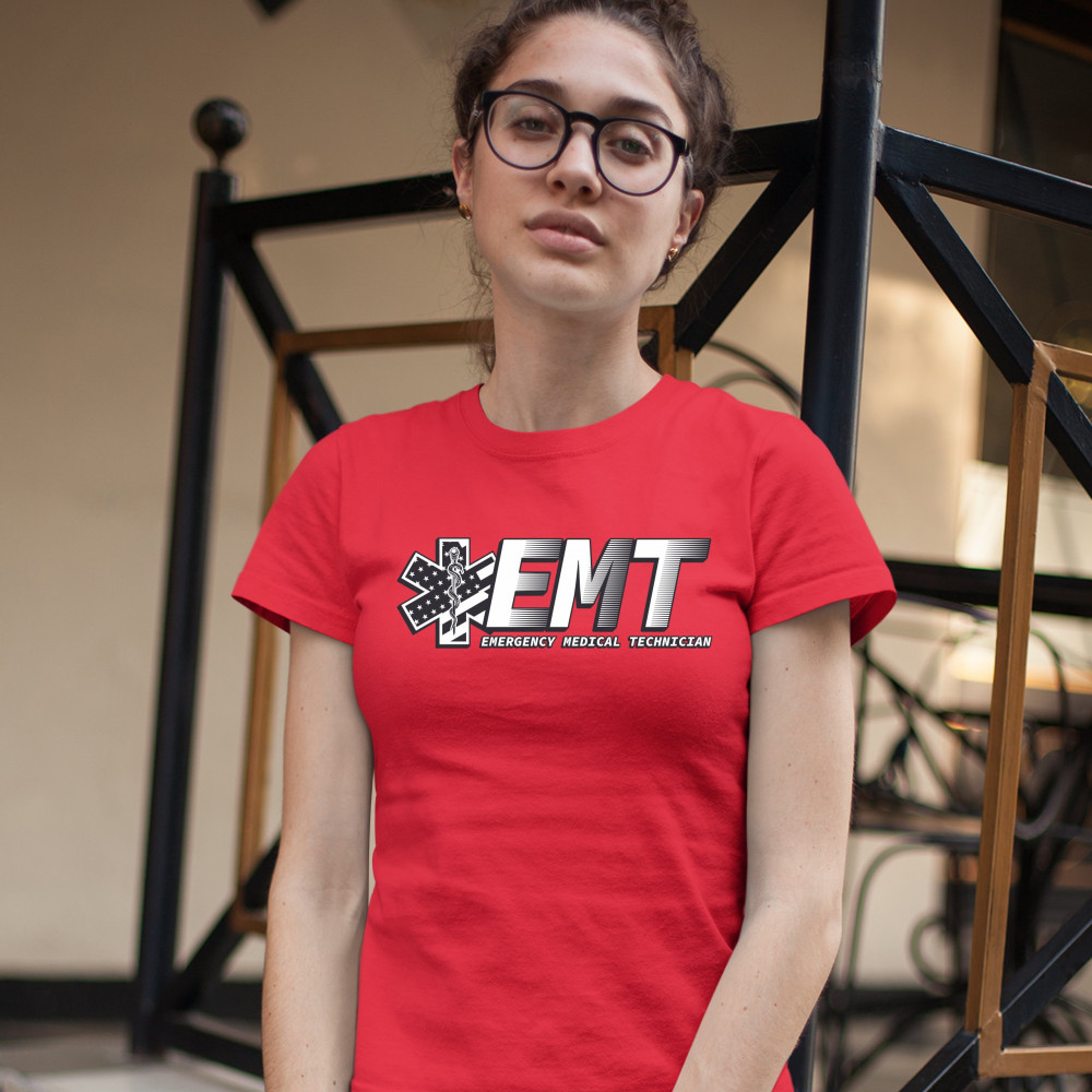 A print featuring big letters "EMT" - an abbreviation for "Emergency Medical Technician". On the left side the print features a Star of Life, the worldwide recognized symbol of emergency medical services, with the Rod of Asclepius and Stars and Stripes in