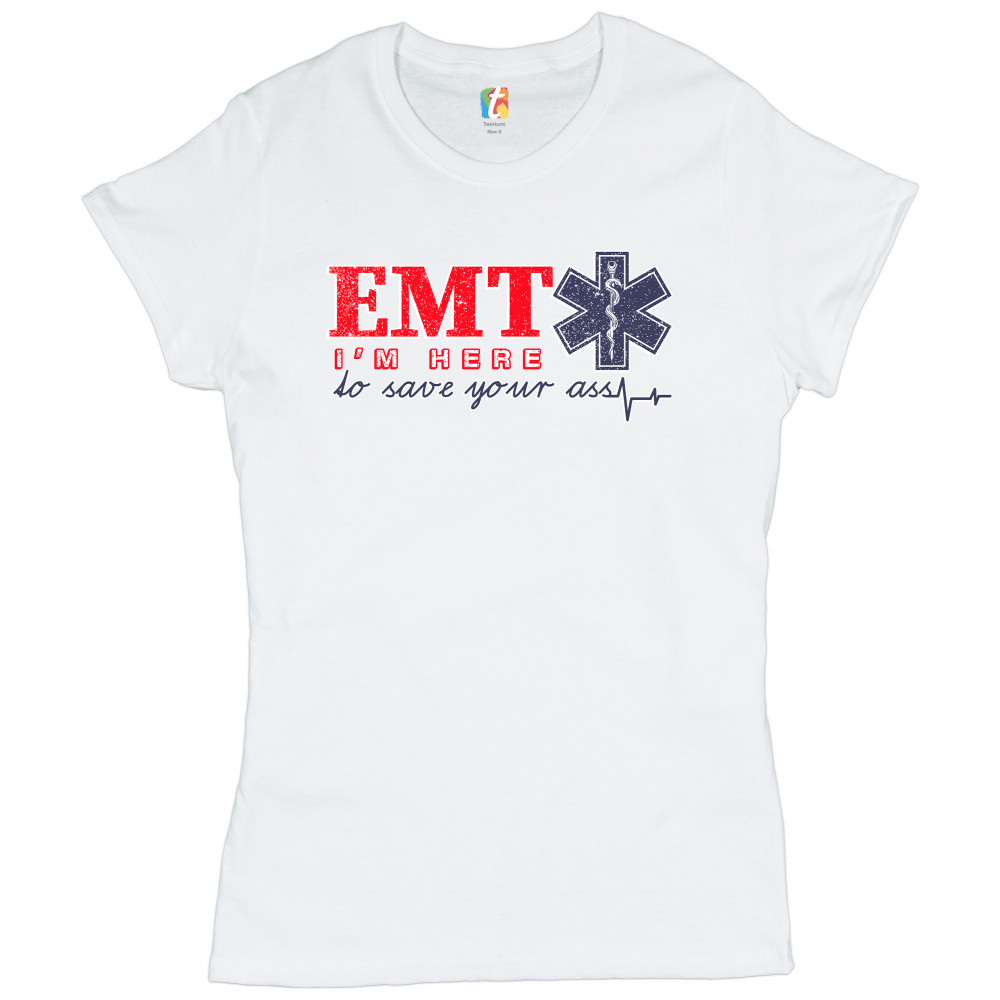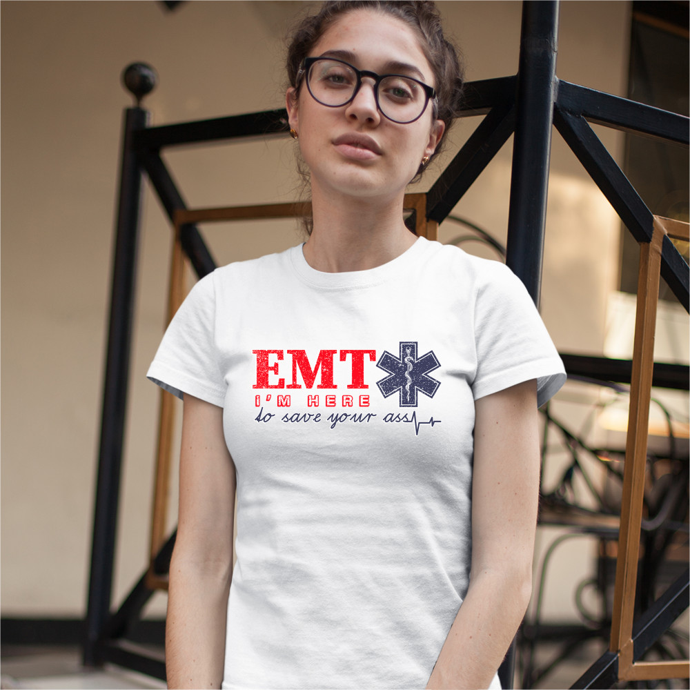 A funny print saying "EMT I'm Here to Save Your Ass". To the right of "EMT" there is the Star of Life, the worldwide recognized symbol of emergency medical services, with the Rod of Asclepius inside of it. A great choice as a gift for a first responder.
