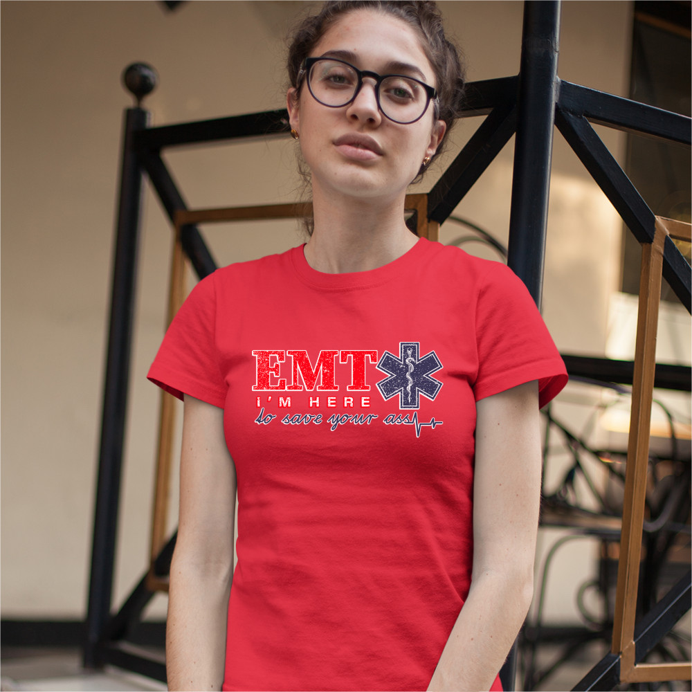 A funny print saying "EMT I'm Here to Save Your Ass". To the right of "EMT" there is the Star of Life, the worldwide recognized symbol of emergency medical services, with the Rod of Asclepius inside of it. A great choice as a gift for a first responder.