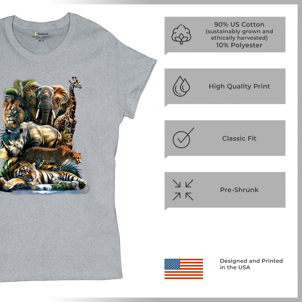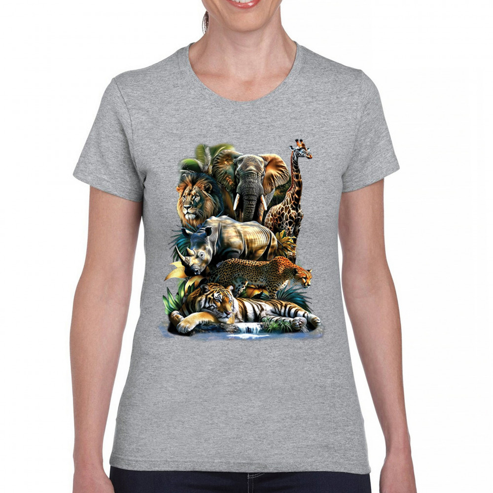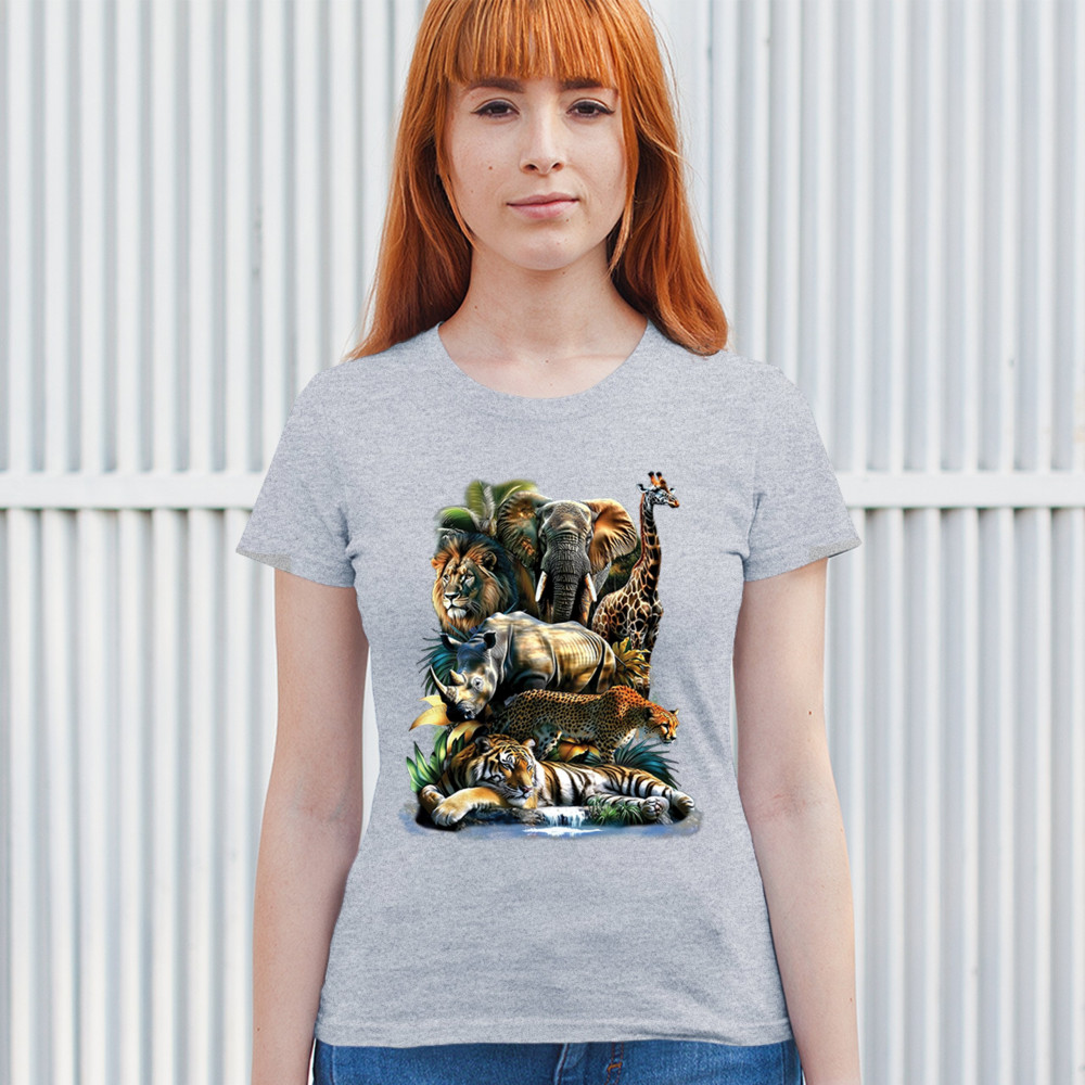Wildlife design with lion, tiger, giraffe, rhino, cheetah, and elephant. Perfect for animal lovers and safari fans who embrace nature’s fierce spirit.