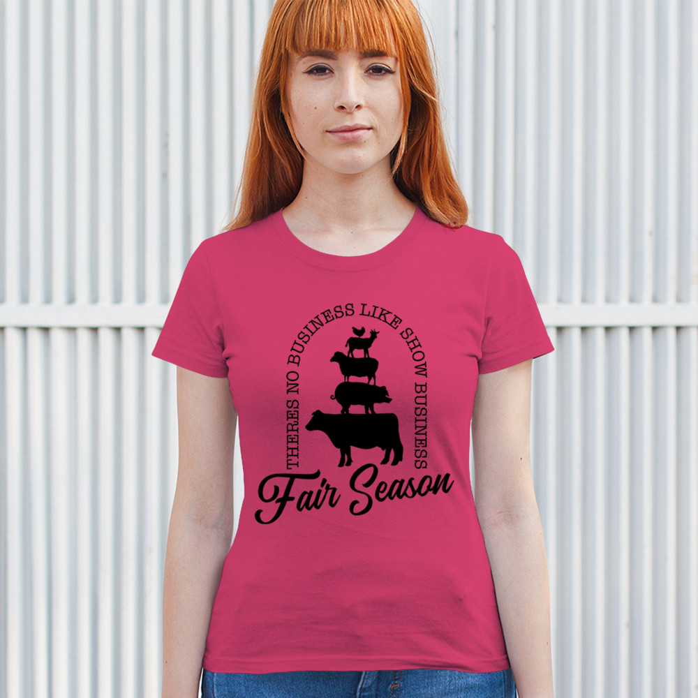 Embrace the spirit of fair season with our "Fair Season" design, ideal for anyone who loves farm animals and the excitement of fairs. Featuring silhouettes of a chicken, goat, sheep, and cow stacked together, this design brings a touch of whimsy and fun to any occasion. Perfect for 4-H members, farmers, and fair enthusiasts, it's a great way to express your love for agricultural fairs and farm life. This design makes an excellent gift, capturing the essence of show business and the joy of the fair season.