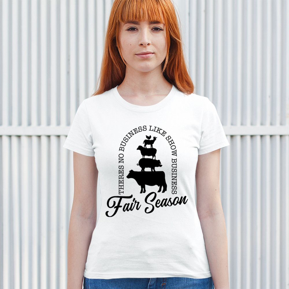 Embrace the spirit of fair season with our "Fair Season" design, ideal for anyone who loves farm animals and the excitement of fairs. Featuring silhouettes of a chicken, goat, sheep, and cow stacked together, this design brings a touch of whimsy and fun to any occasion. Perfect for 4-H members, farmers, and fair enthusiasts, it's a great way to express your love for agricultural fairs and farm life. This design makes an excellent gift, capturing the essence of show business and the joy of the fair season.