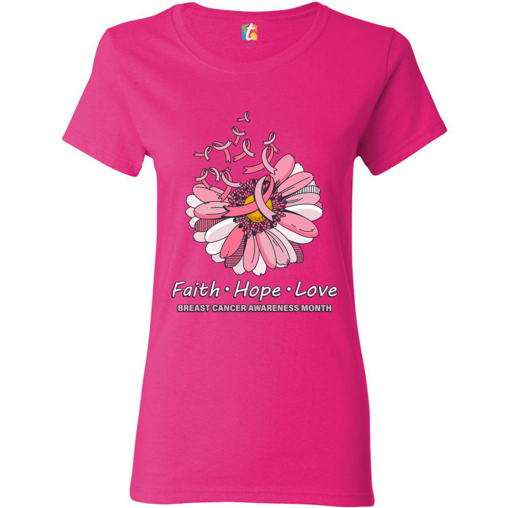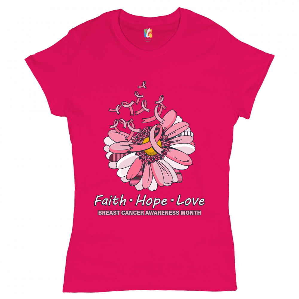 A print featuring a big flower with several petals missing and numerous pink ribbons flying away from it. The print says: "Faith Hope Love" and "Breast Cancer Awareness Month". Wear it to spread awareness abouth the disease and support a person you know w