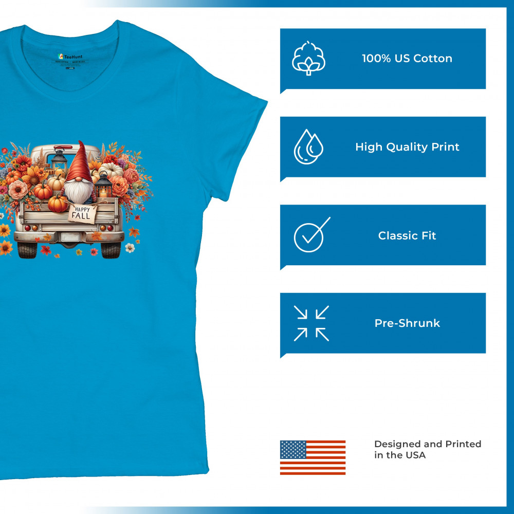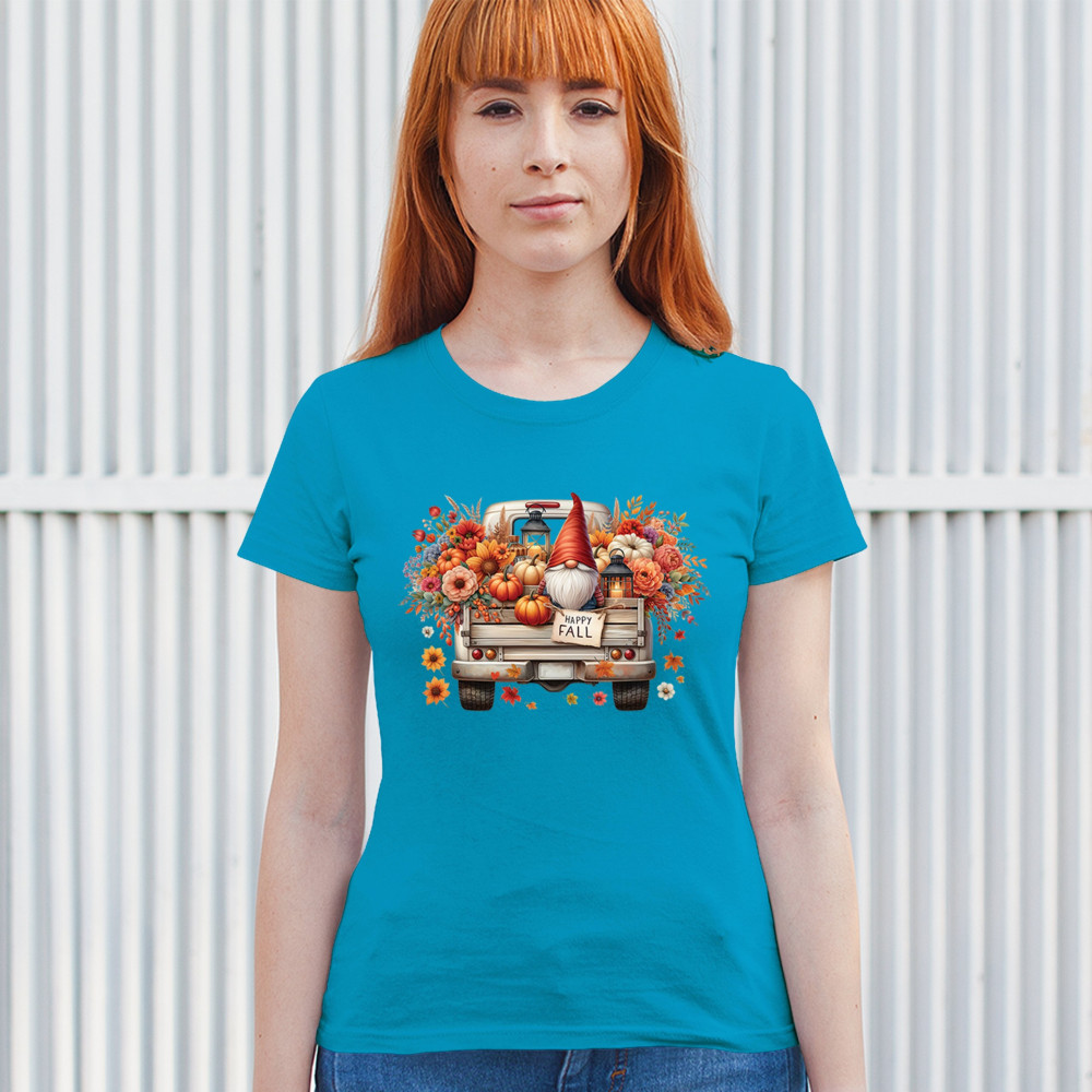 Bring fall charm into your wardrobe with this rustic gnome truck design. Overflowing with pumpkins, wildflowers, and a glowing lantern, it’s perfect for Thanksgiving, farmhouse gatherings, harvest festivals, and celebrating the floral autumn season in cozy style.