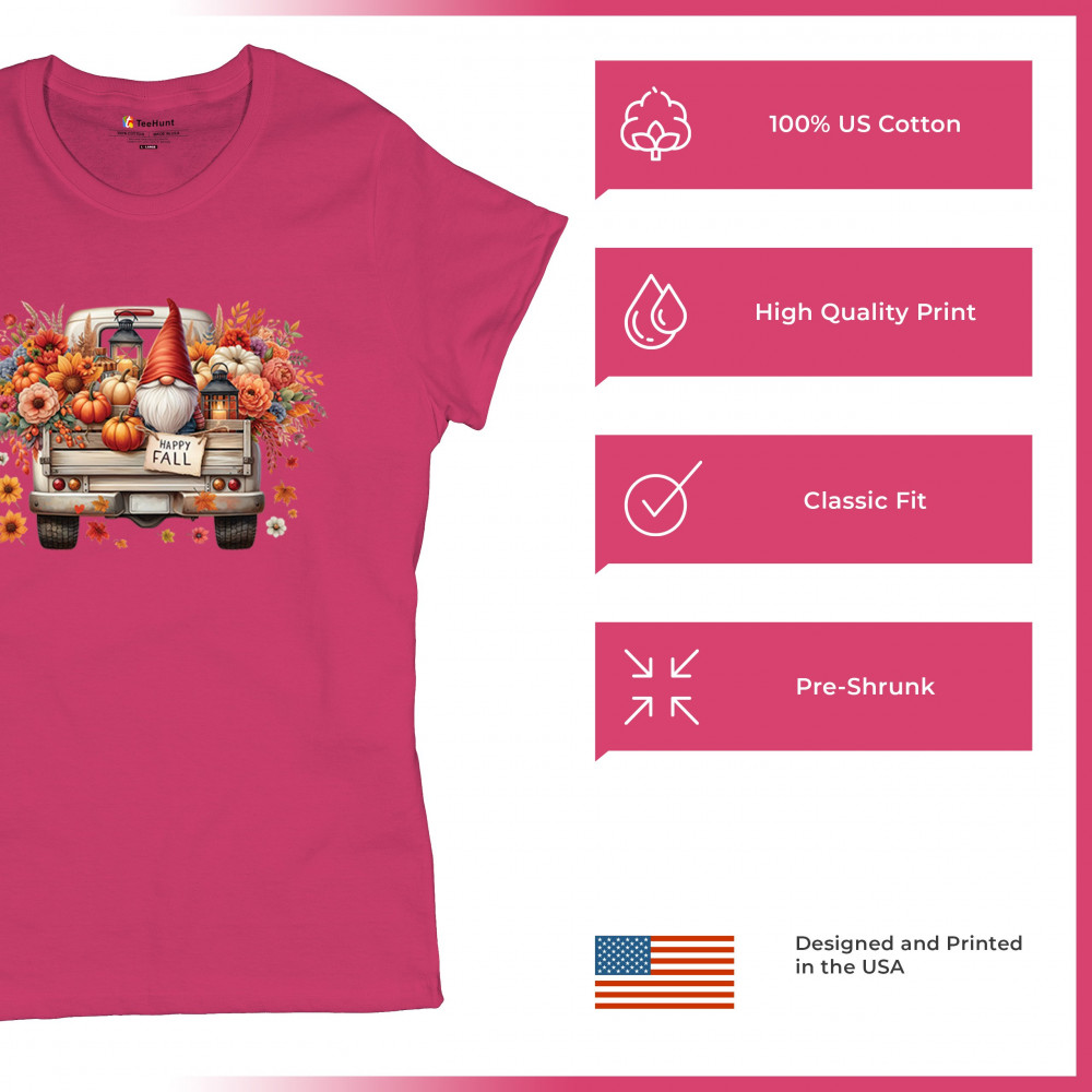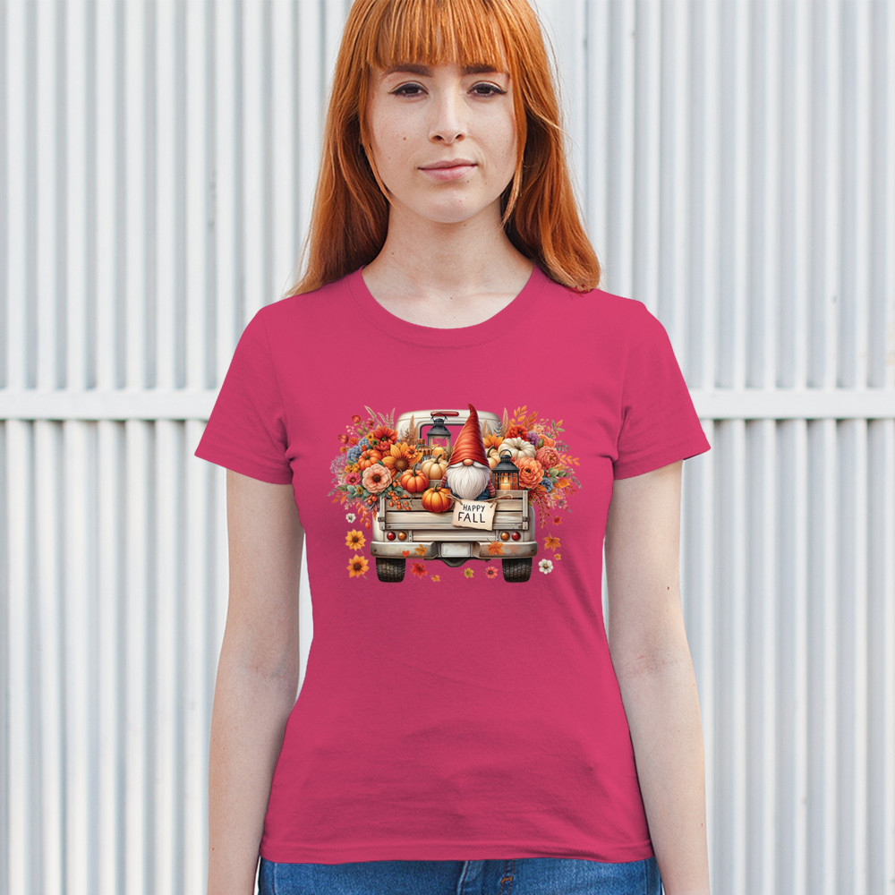 Bring fall charm into your wardrobe with this rustic gnome truck design. Overflowing with pumpkins, wildflowers, and a glowing lantern, it’s perfect for Thanksgiving, farmhouse gatherings, harvest festivals, and celebrating the floral autumn season in cozy style.