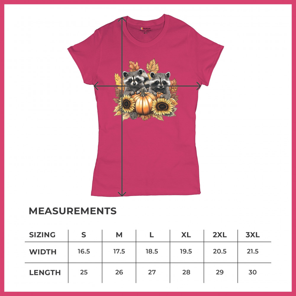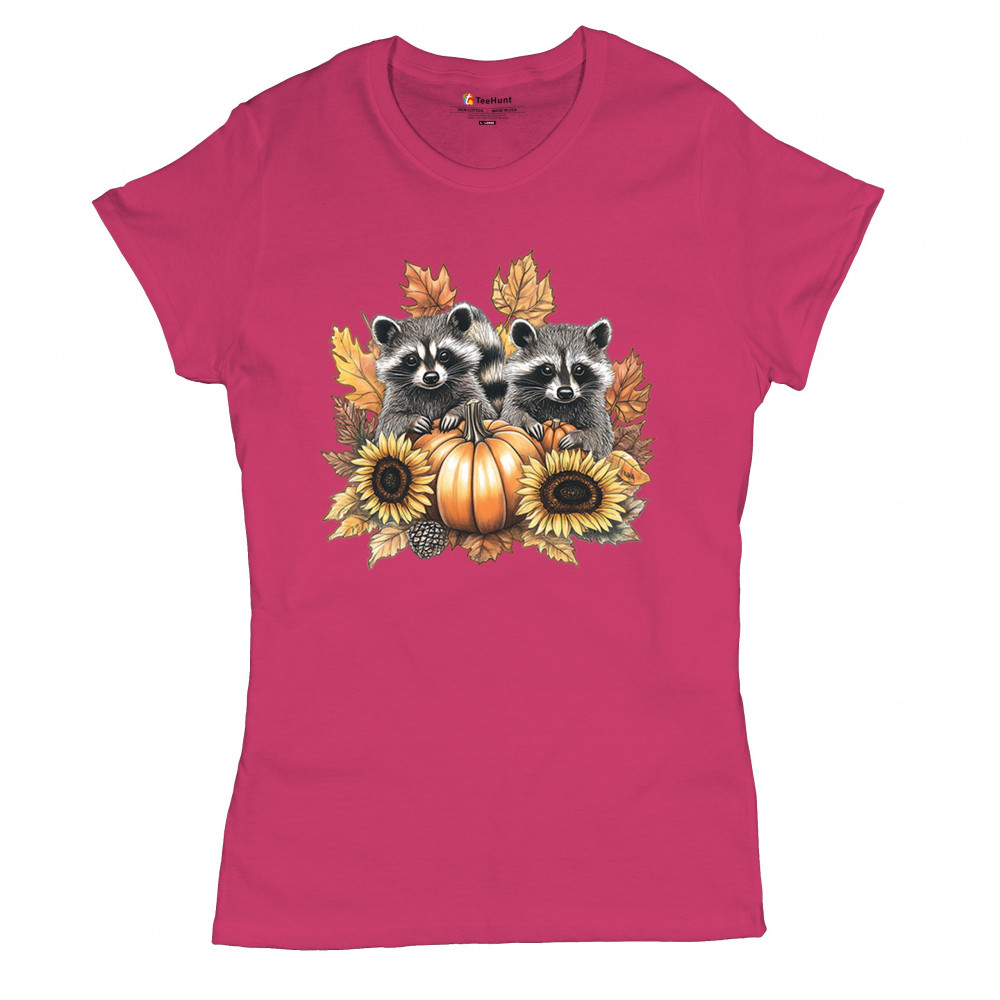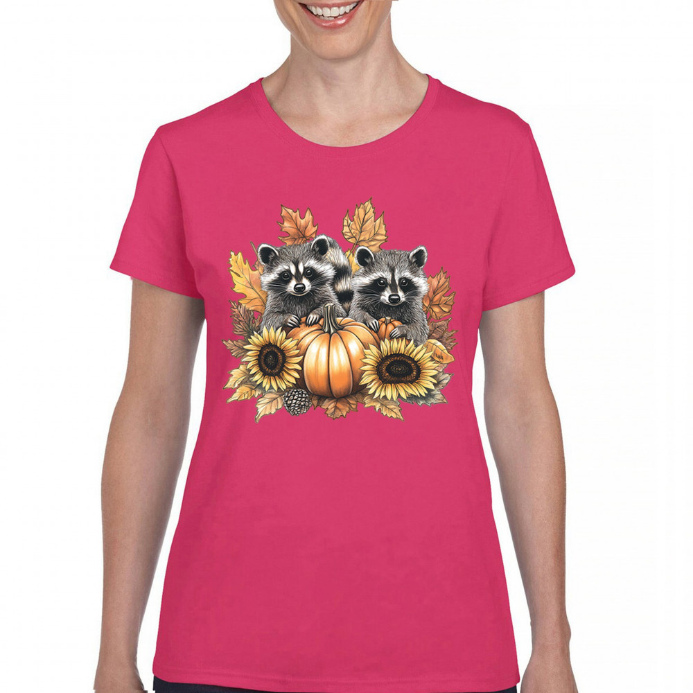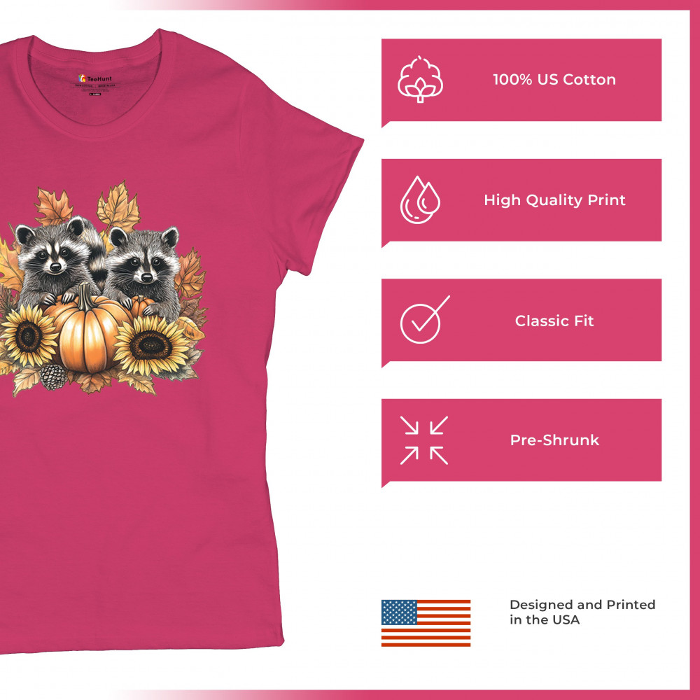 Rustic autumn raccoon design with pumpkins and sunflowers. Perfect for Thanksgiving, pumpkin patch days, farmhouse harvest, and woodland fall fashion.