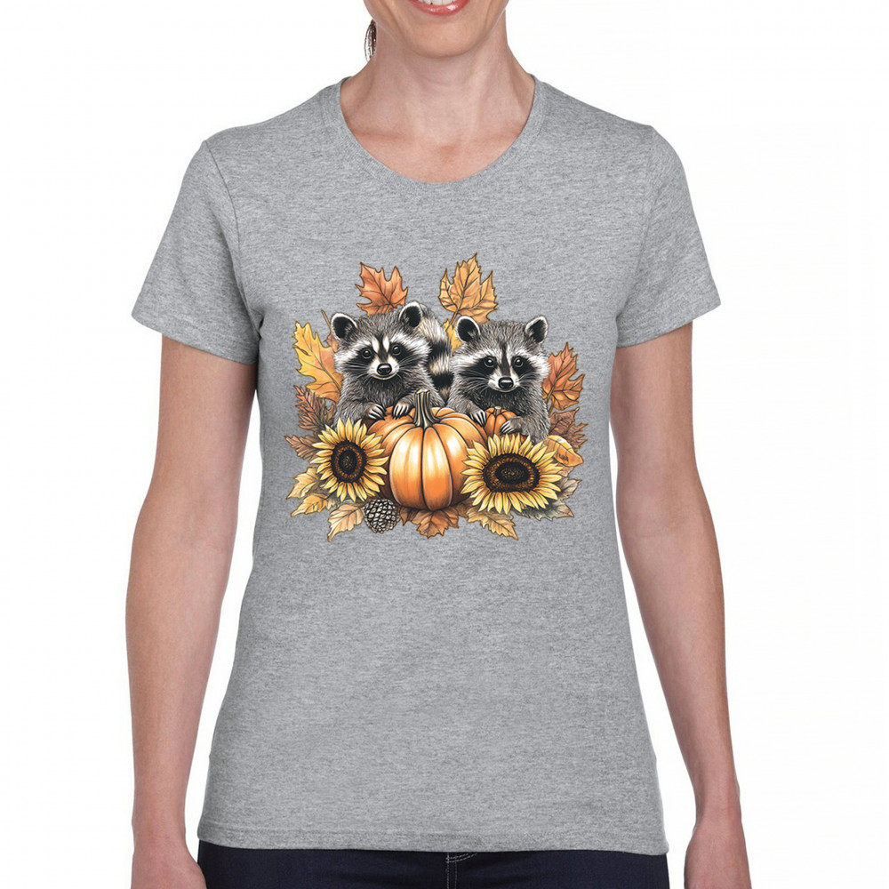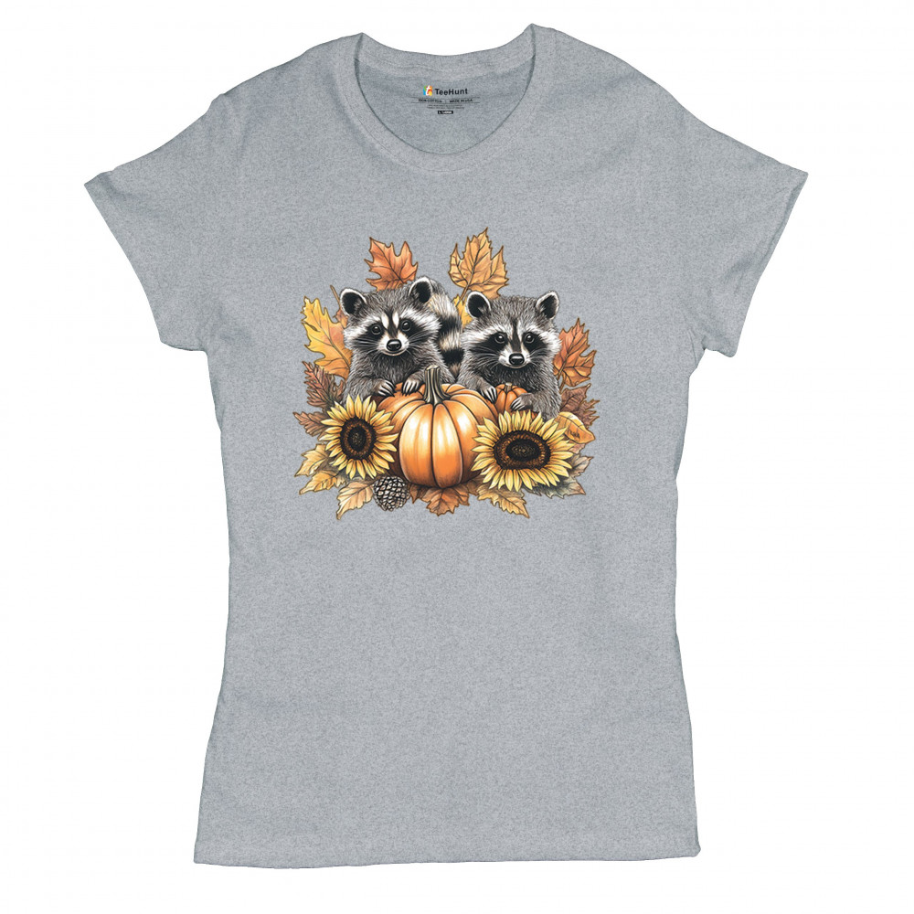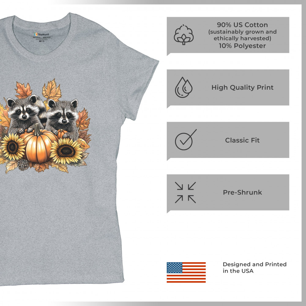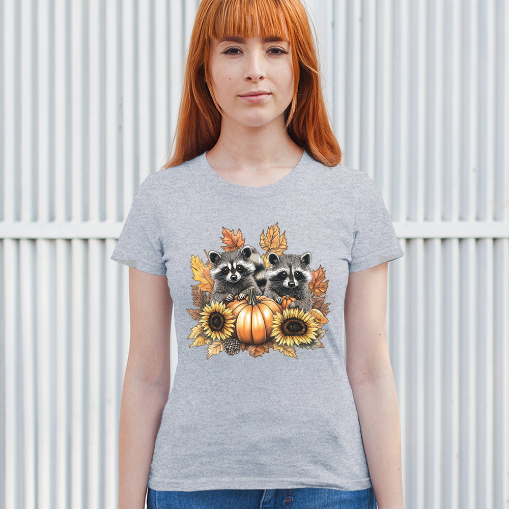 Rustic autumn raccoon design with pumpkins and sunflowers. Perfect for Thanksgiving, pumpkin patch days, farmhouse harvest, and woodland fall fashion.