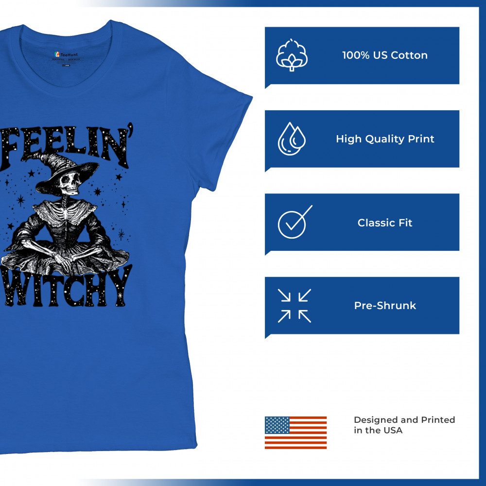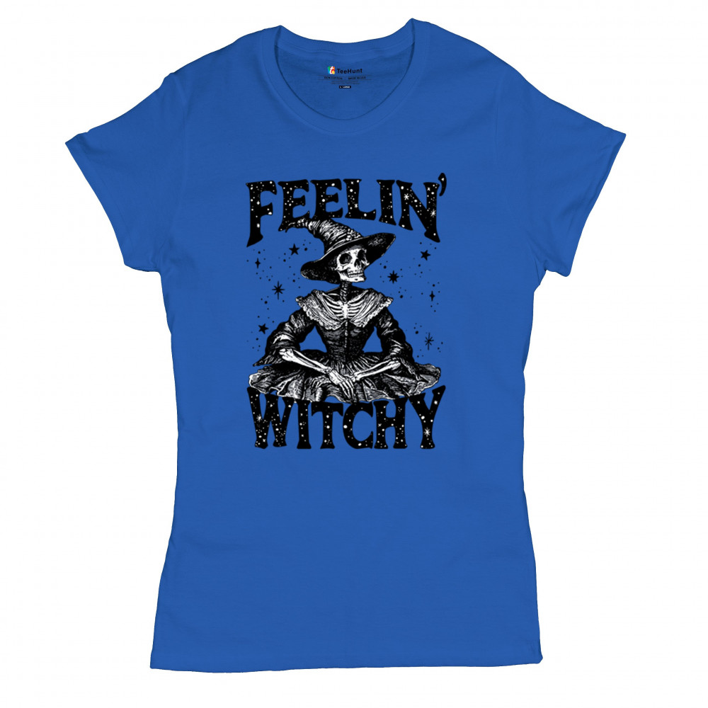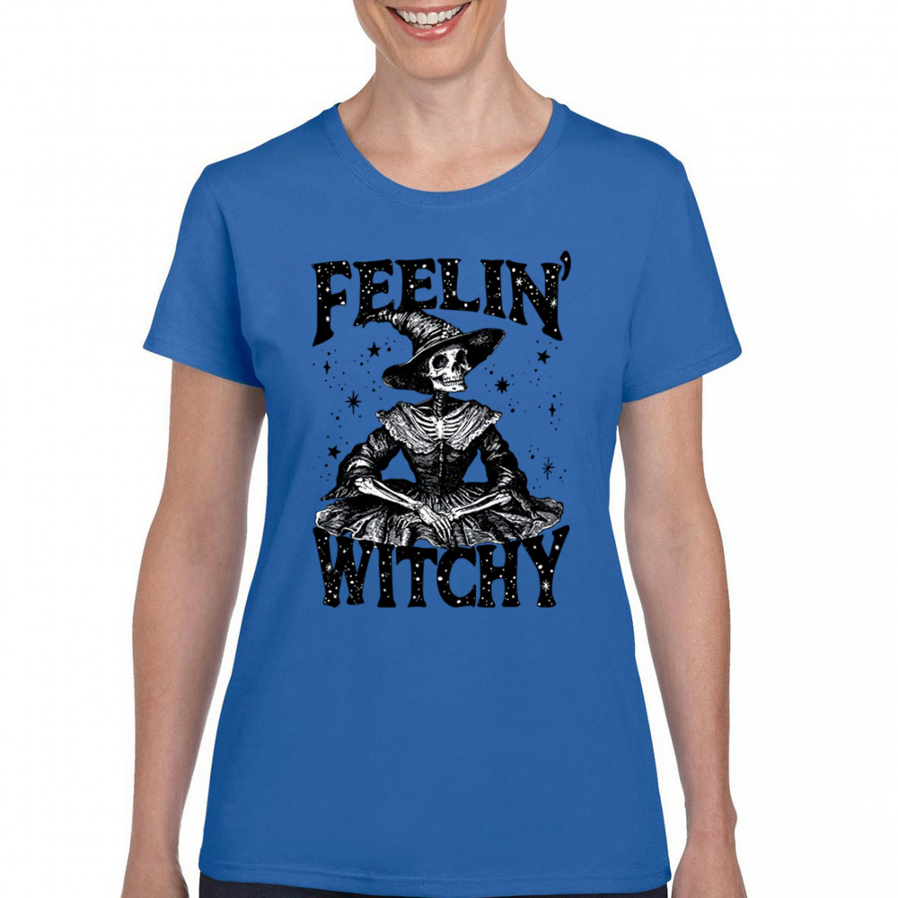 Add a touch of enchantment to your wardrobe with this "Feelin' Witchy" design. Perfect for Halloween, themed parties, or everyday wear, this piece captures gothic aesthetics with playful charm. Featuring a skeleton dressed as a witch, it celebrates the lighter side of spooky fashion. Ideal for those who enjoy blending whimsy with the supernatural, it's a must-have for the season.