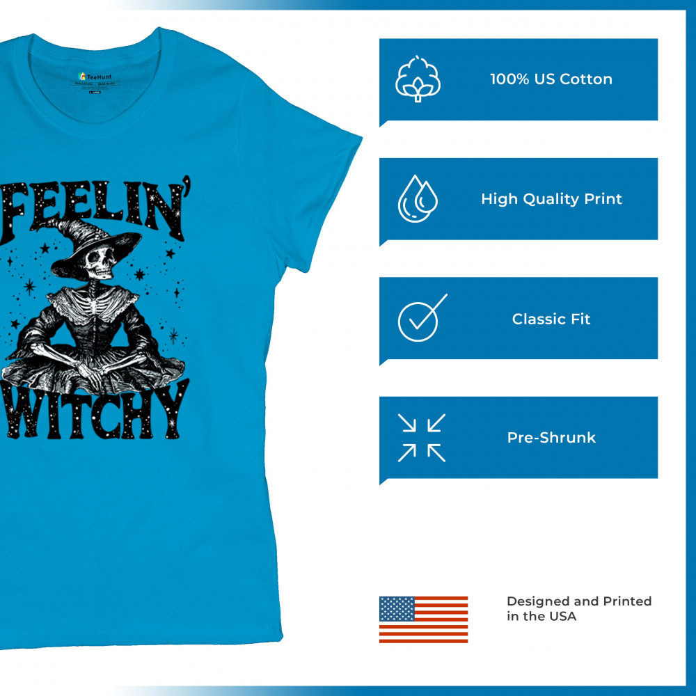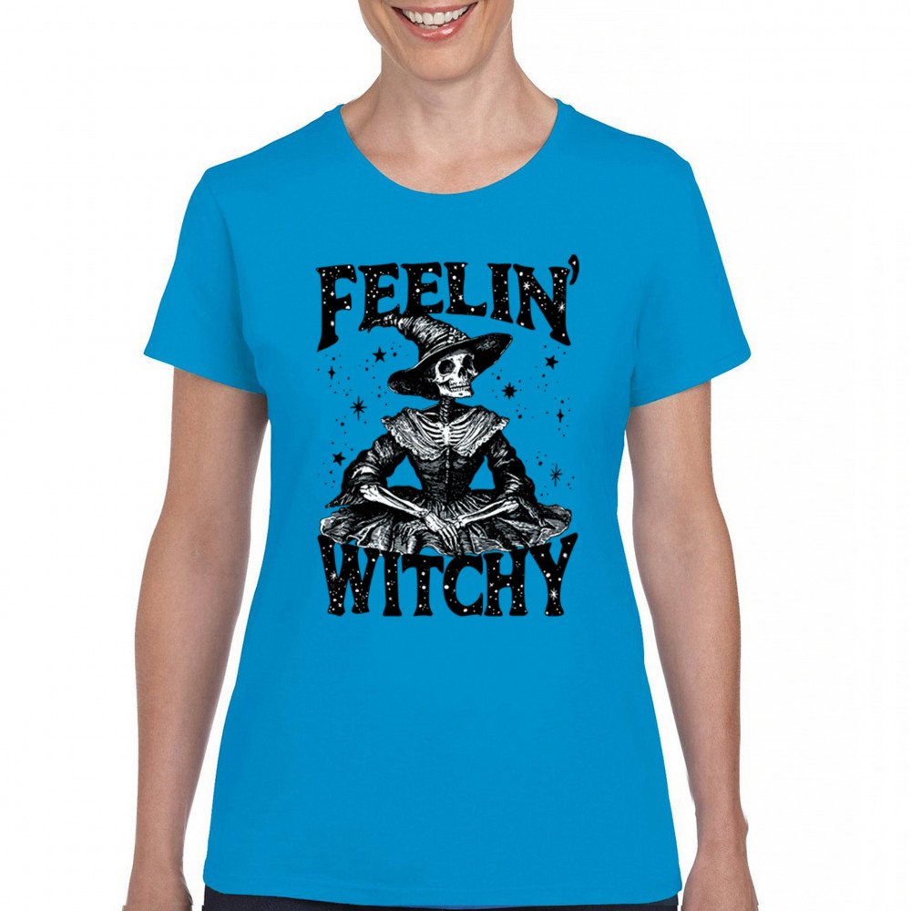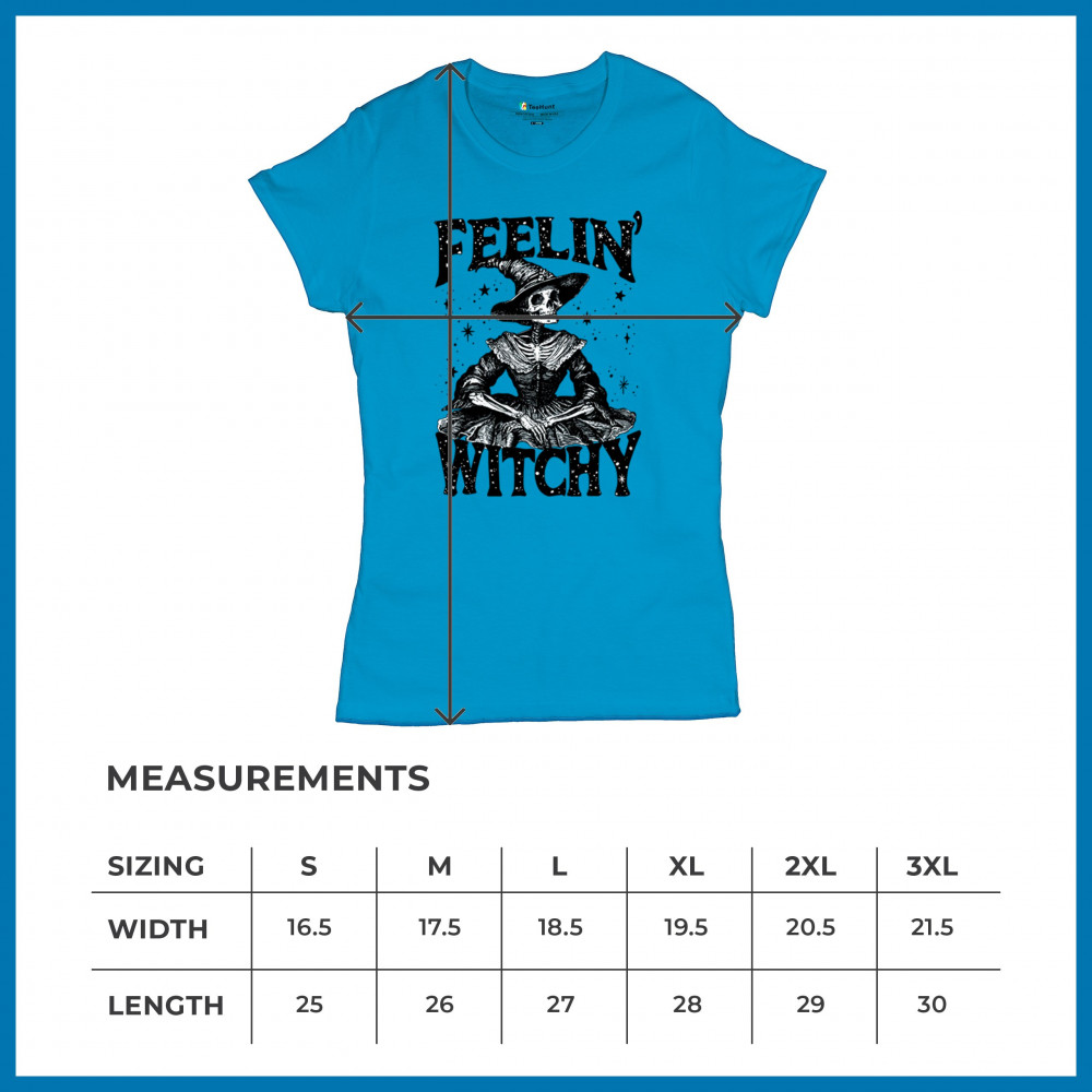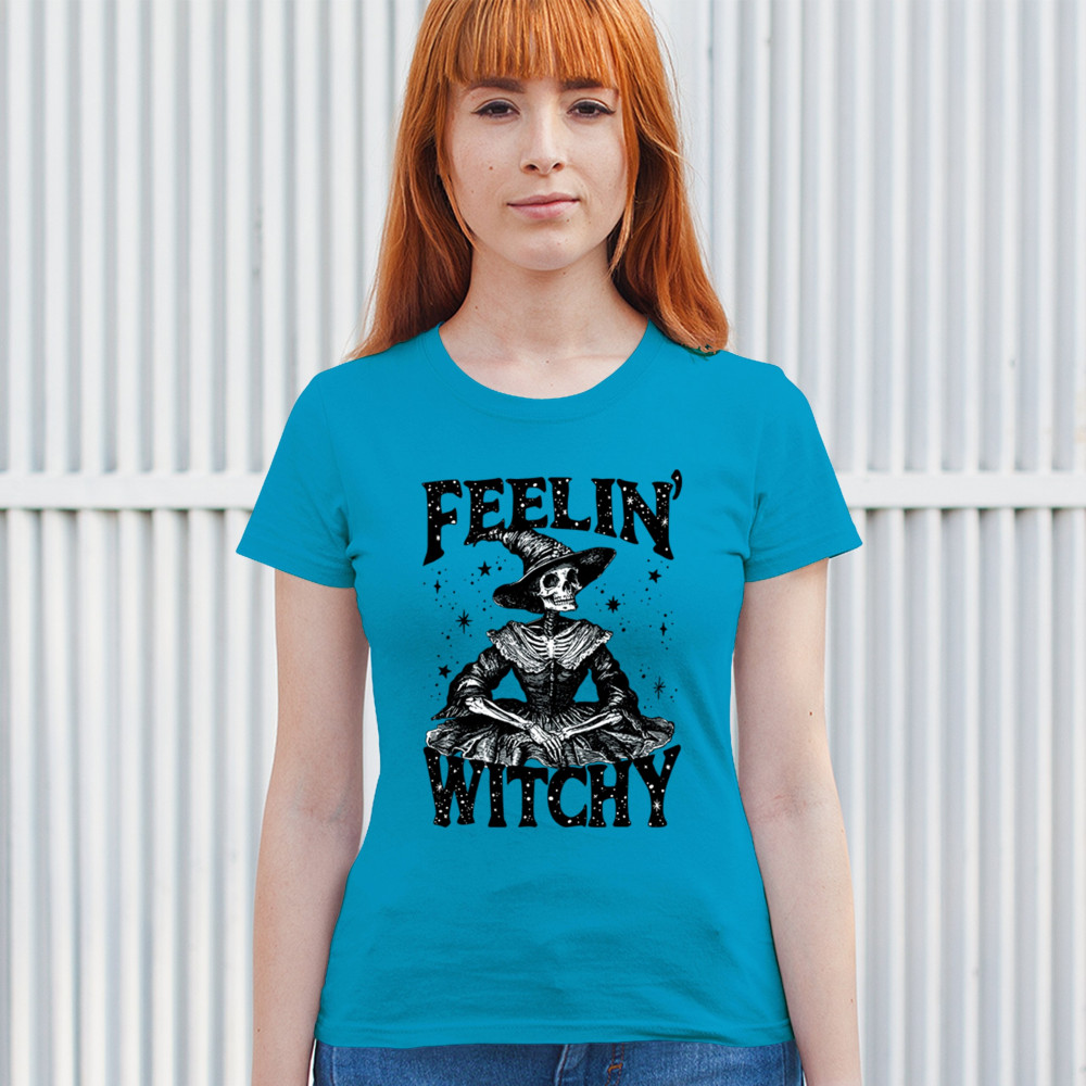 Add a touch of enchantment to your wardrobe with this "Feelin' Witchy" design. Perfect for Halloween, themed parties, or everyday wear, this piece captures gothic aesthetics with playful charm. Featuring a skeleton dressed as a witch, it celebrates the lighter side of spooky fashion. Ideal for those who enjoy blending whimsy with the supernatural, it's a must-have for the season.