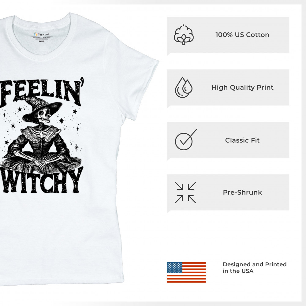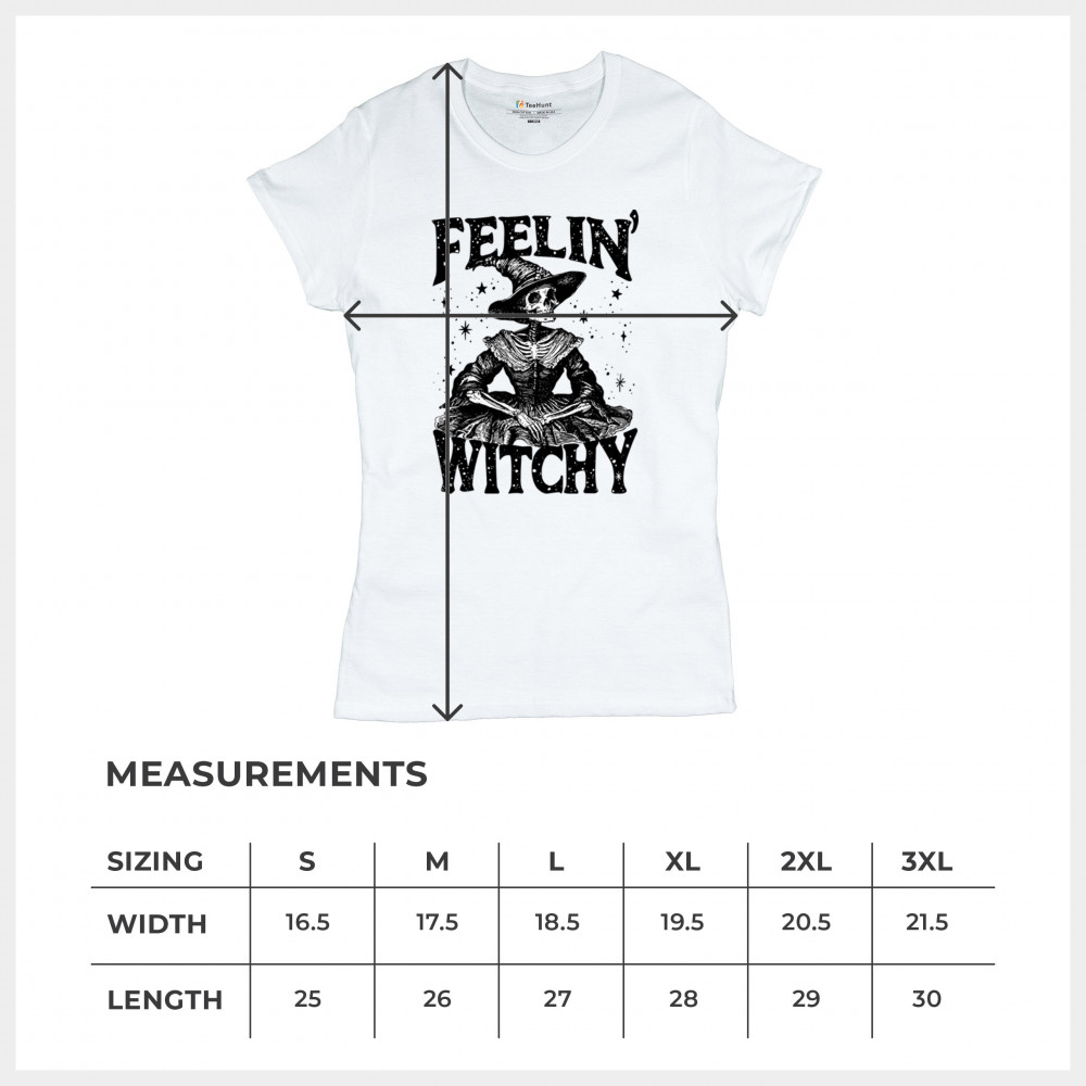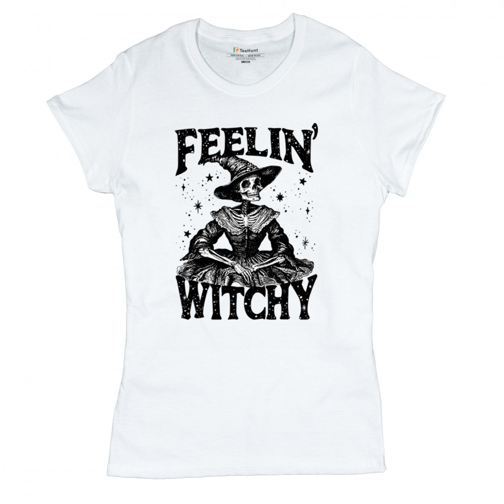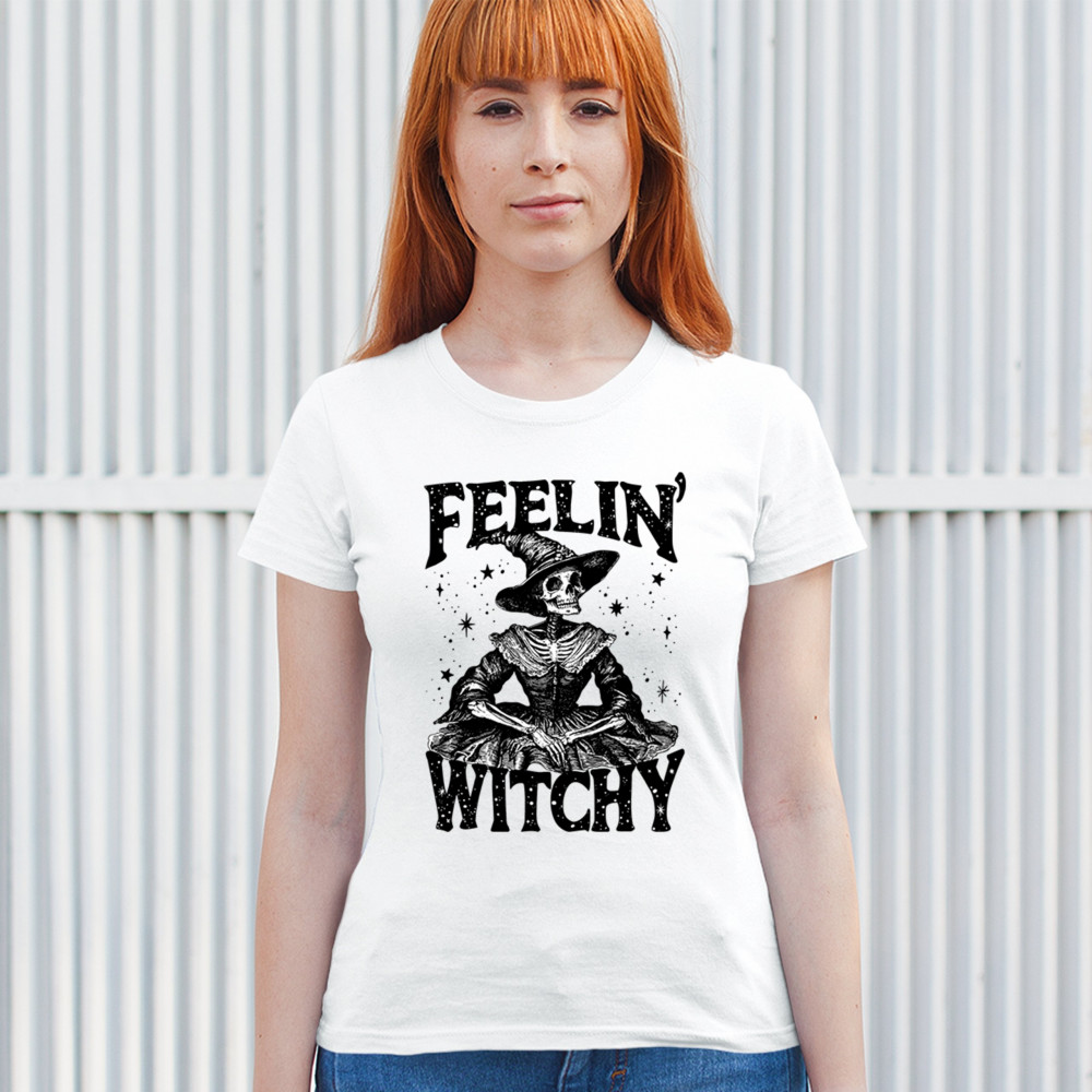 Add a touch of enchantment to your wardrobe with this "Feelin' Witchy" design. Perfect for Halloween, themed parties, or everyday wear, this piece captures gothic aesthetics with playful charm. Featuring a skeleton dressed as a witch, it celebrates the lighter side of spooky fashion. Ideal for those who enjoy blending whimsy with the supernatural, it's a must-have for the season.