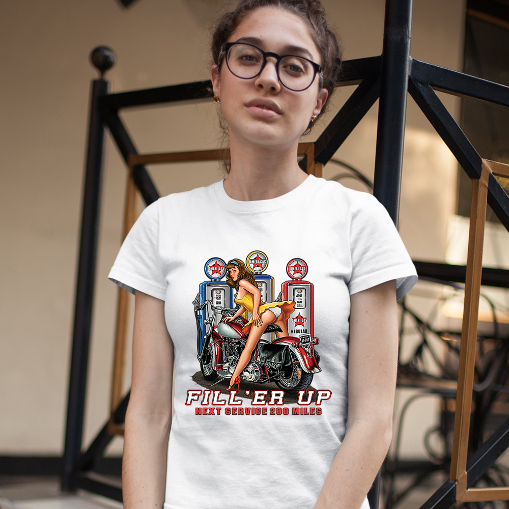 FILL 'ER UP t-shirt sexy pin-up girl biker rider live to ride women's tee white
