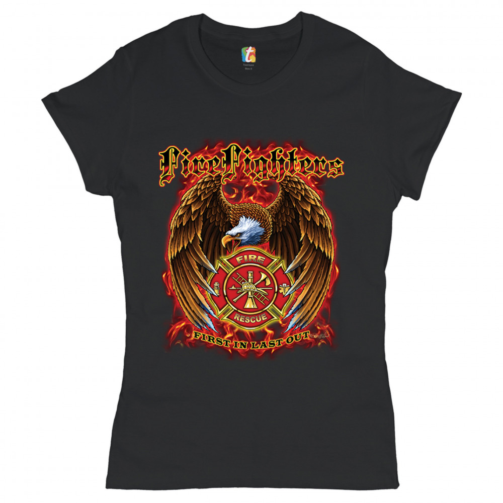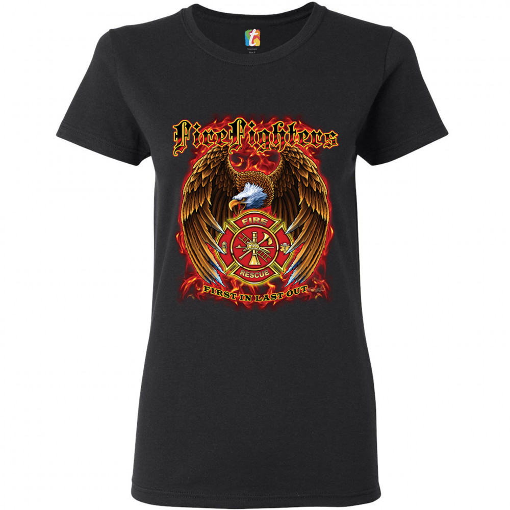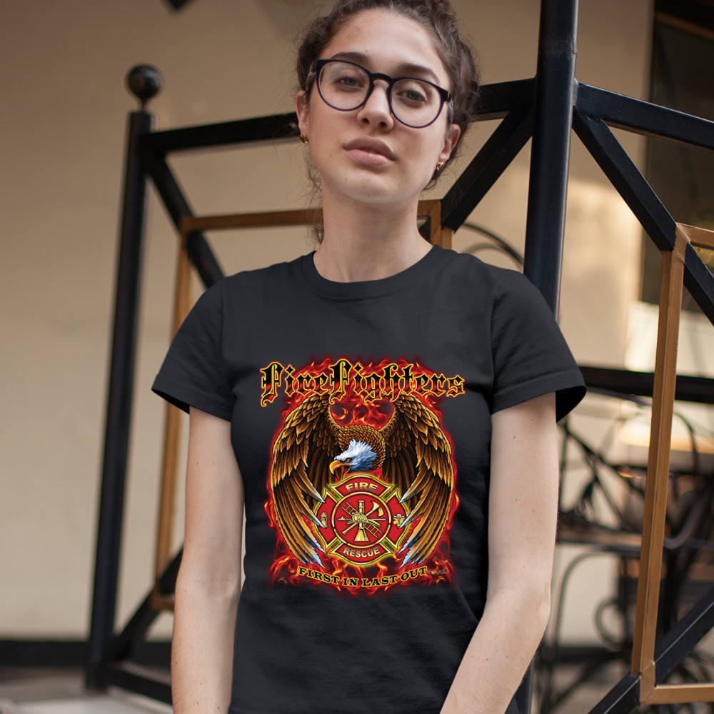 FIREFIGHTERS FIRST IN LAST OUT t-shirt fire and rescue bald eagle women's tee black