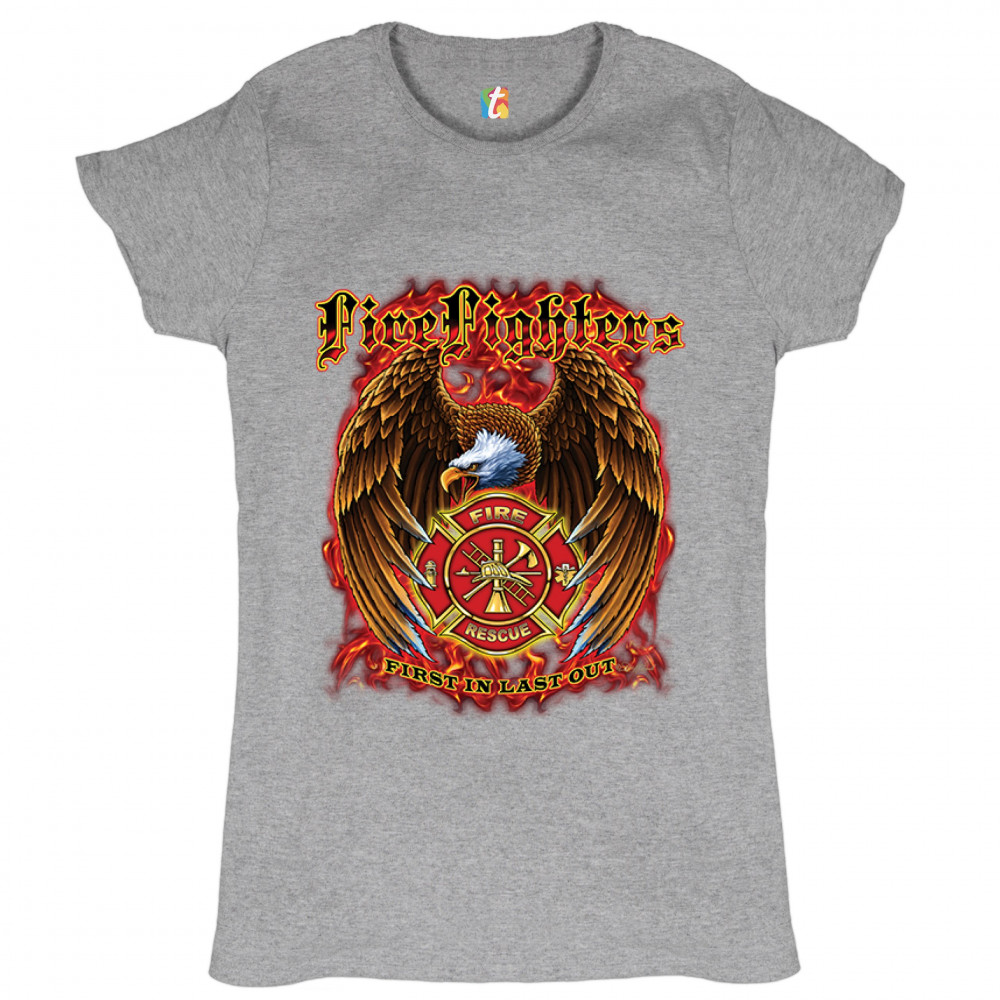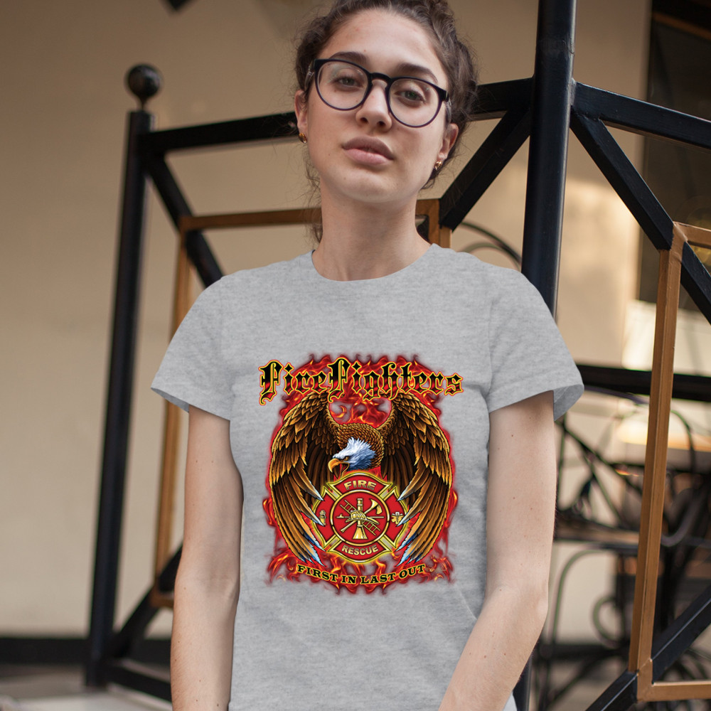 FIREFIGHTERS FIRST IN LAST OUT t-shirt fire and rescue bald eagle women's tee gray