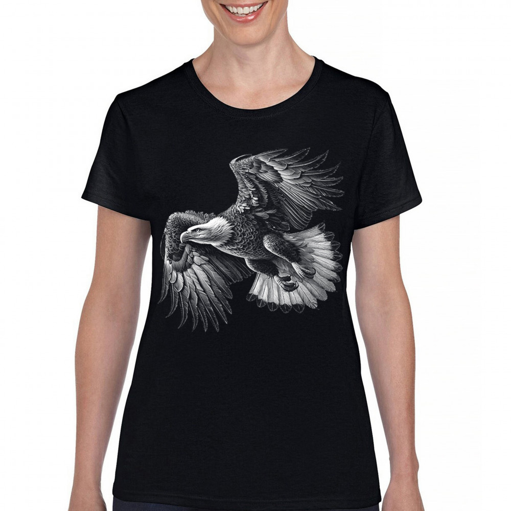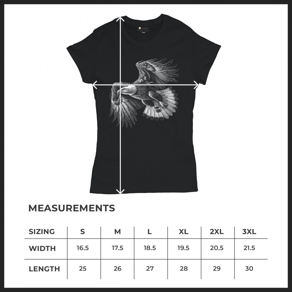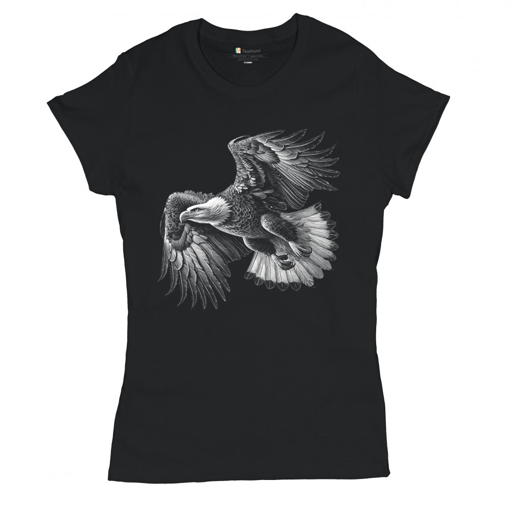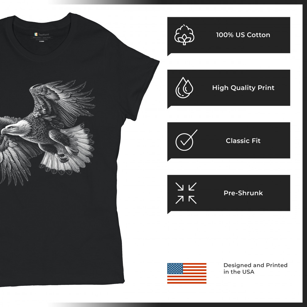 Celebrate American pride with this soaring bald eagle design. With wings extended and monochrome detail that symbolizes liberty and strength, it's perfect for patriots, veterans, and national holiday wear. A timeless tribute to freedom, this design is ideal for memorial events, rallies, and anyone who honors the red, white, and blue.