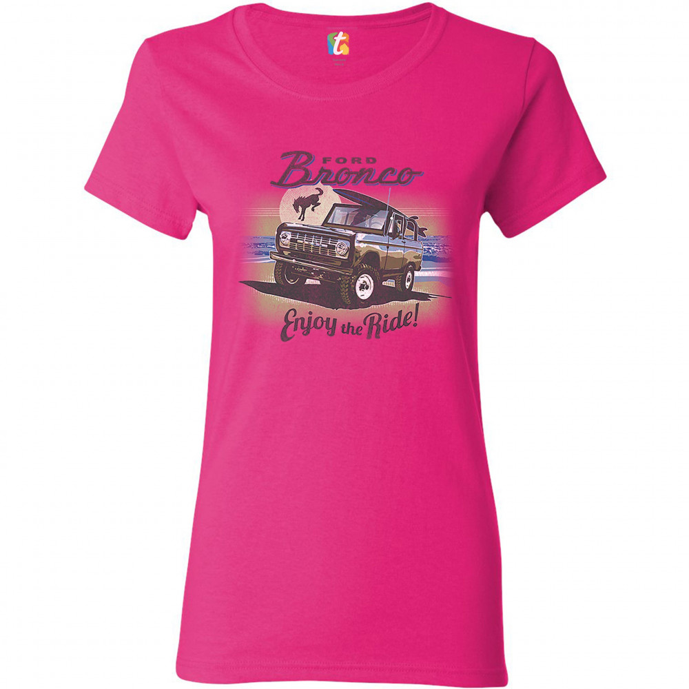 A print featuring a Ford Bronco parked at a beach with a surfboard on it's roof. The print says: "Ford Bronco" and "Enhoy the Ride!". There is a Bronco logo by the windshield. A great choice for any Ford owner who is passionate about powerful trucks and o