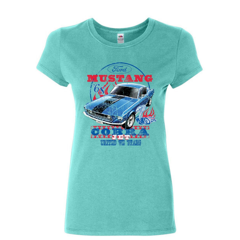 FORD MUSTANG COBRA 1968 women's t-shirt united we stang american classic shirt light blue