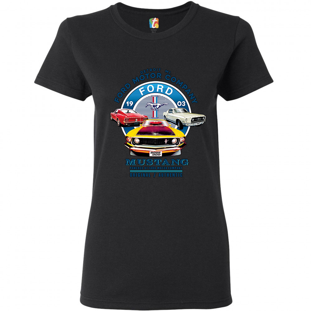 A print featuring three classic Ford Mustangs and their logo in the center. The print says: "Detroit Mi. Ford Motor Company, 1903 Ford Mustang, Powered by Ford Motor Company, Original/Authentic". A great choice for anyone who is a fan of old school Ford M