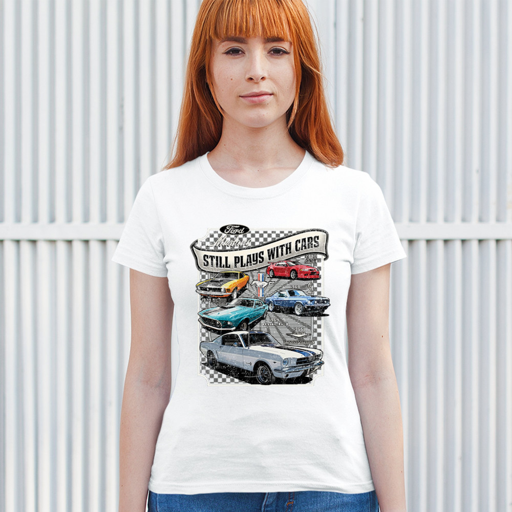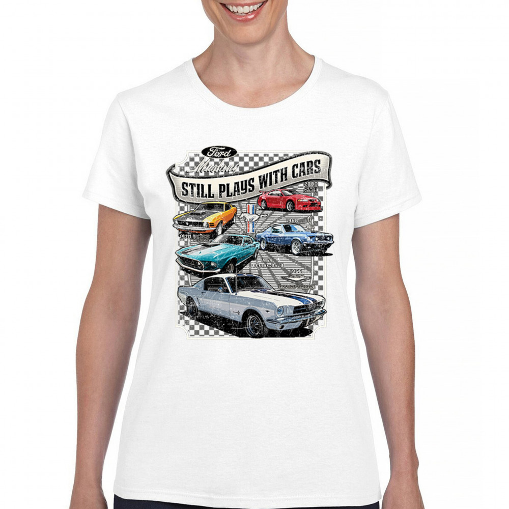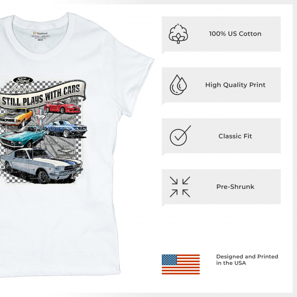 This bold Ford Mustang "Still Plays With Cars" design showcases six classic models from 1965 to 2000, including the 1969 Mach 1, 1970 Boss 302, and 2000 SVT. A dream graphic for muscle car lovers, collectors, and pony car fans. Great for classic auto shows, retro cruises, garage wear, or car clubs.