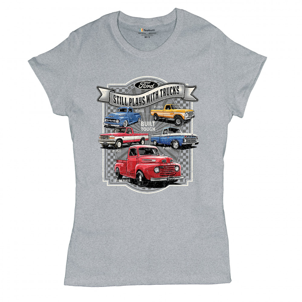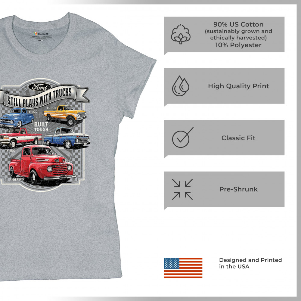 Features classic Ford F-Series trucks from 1949 to F-150. Great for vintage truck fans, garage wear, car shows, and collectors who love pickups.
