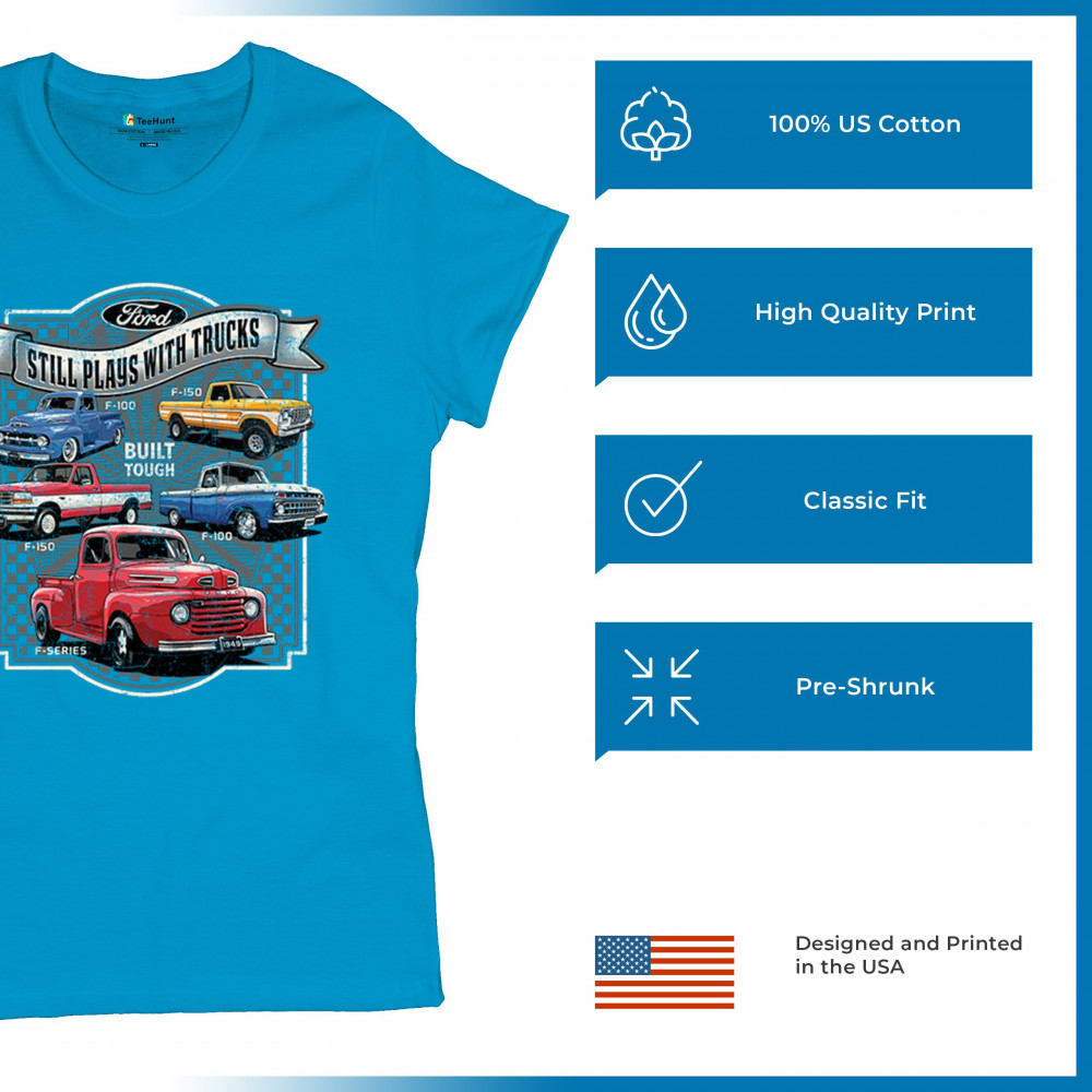 Features classic Ford F-Series trucks from 1949 to F-150. Great for vintage truck fans, garage wear, car shows, and collectors who love pickups.