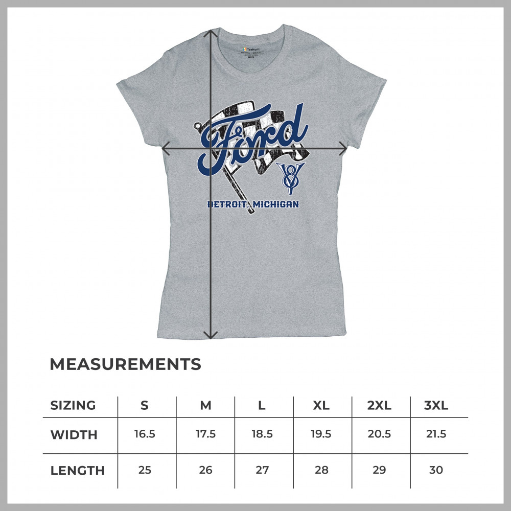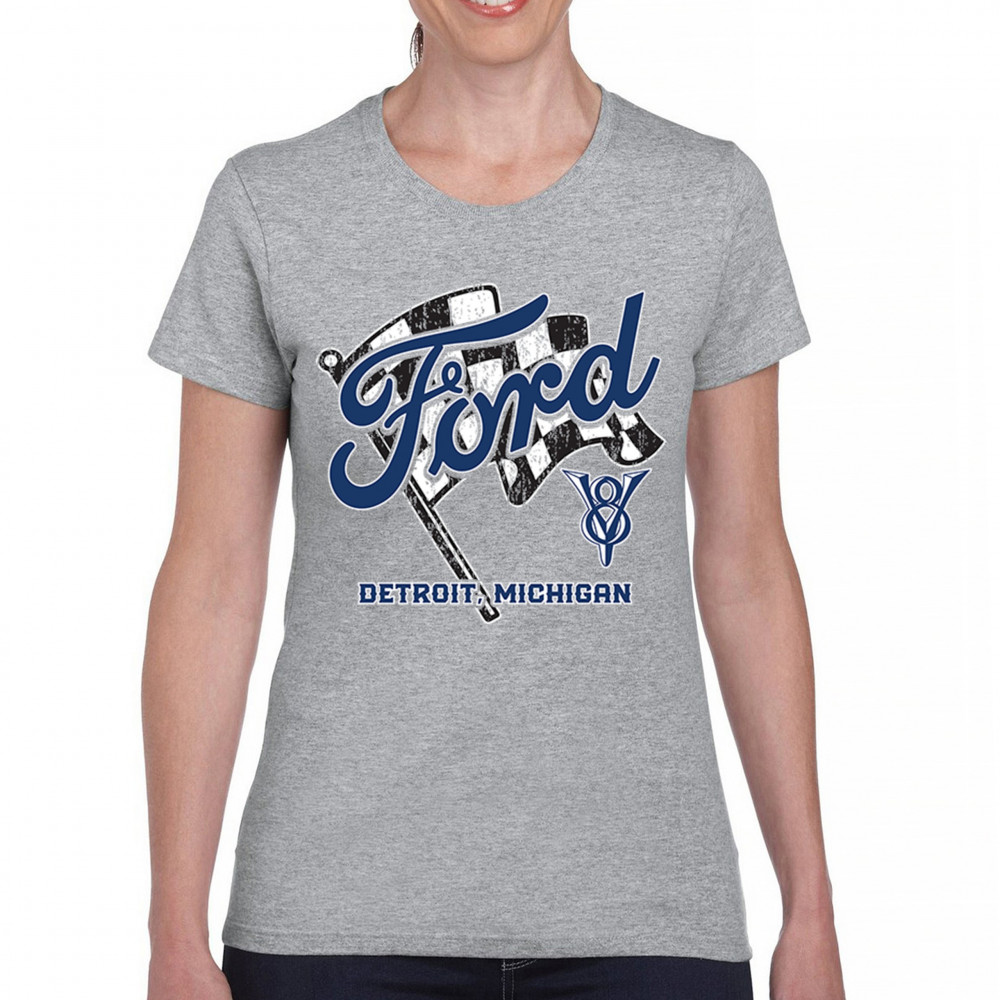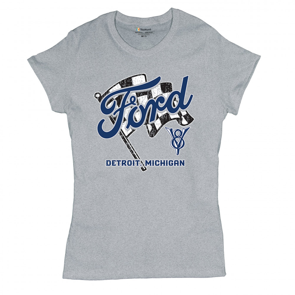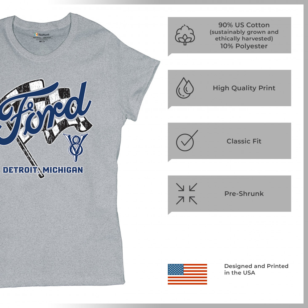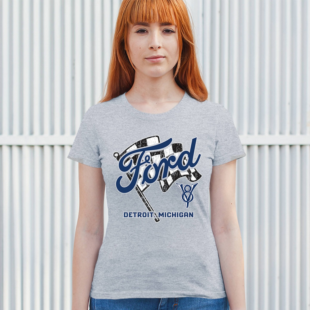 Honor Detroit, Michigan’s Ford legacy with this officially licensed design featuring a checkered flag and bold V8 emblem, perfect for muscle car fans and classic car lovers.