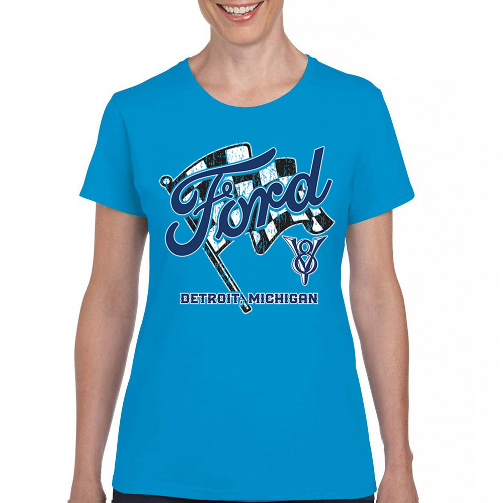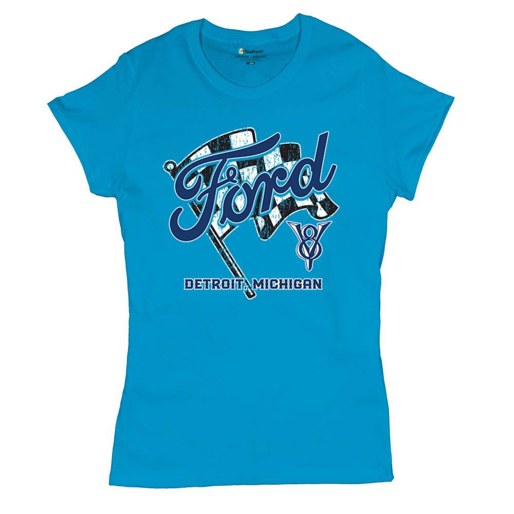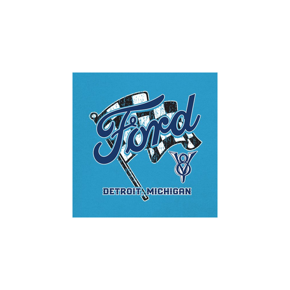 Honor Detroit, Michigan’s Ford legacy with this officially licensed design featuring a checkered flag and bold V8 emblem, perfect for muscle car fans and classic car lovers.