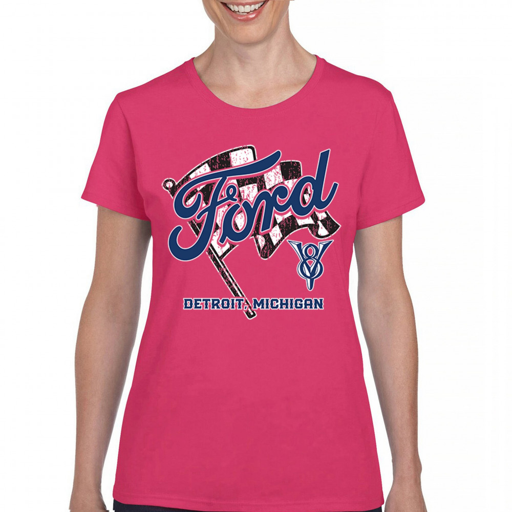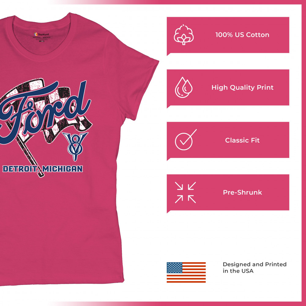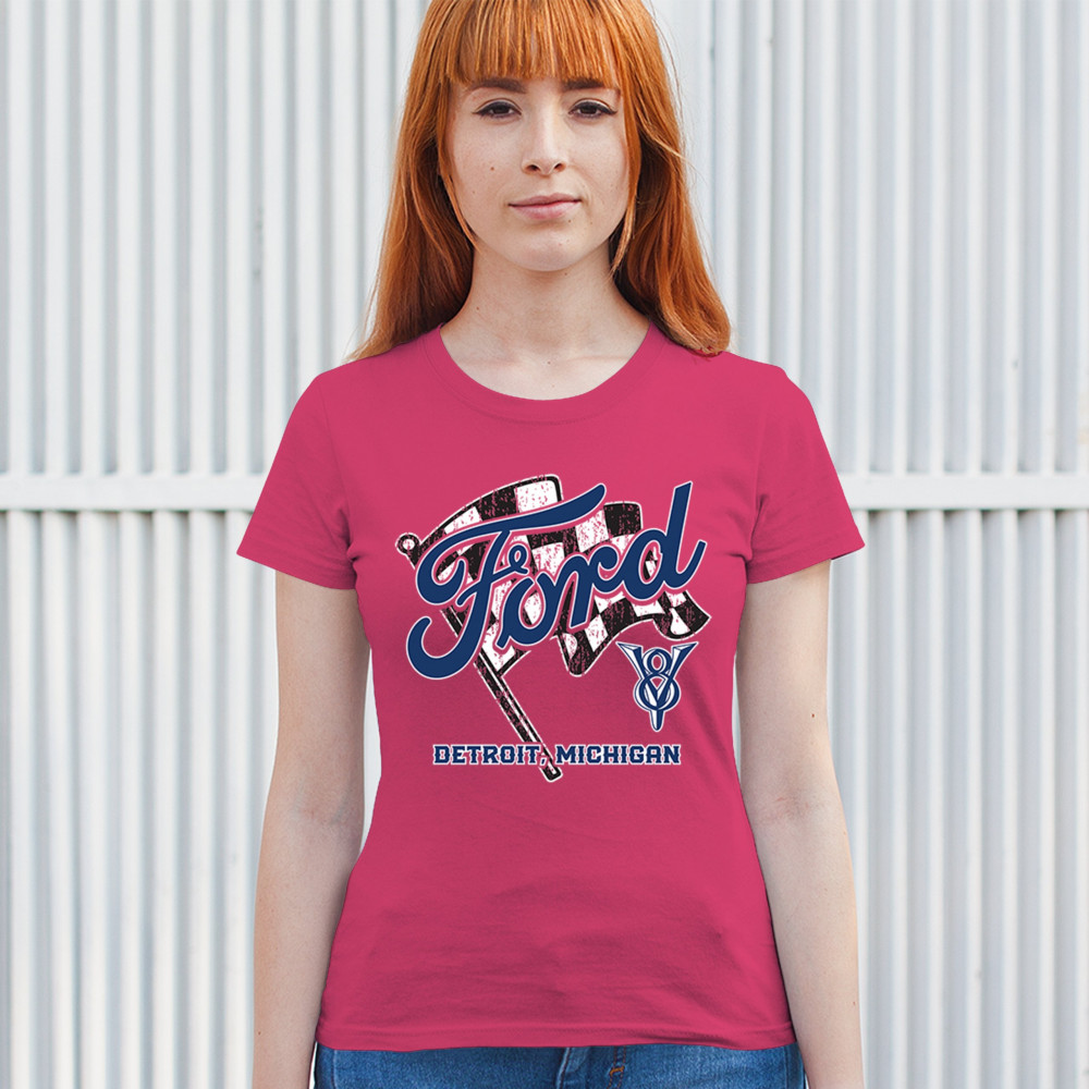 Honor Detroit, Michigan’s Ford legacy with this officially licensed design featuring a checkered flag and bold V8 emblem, perfect for muscle car fans and classic car lovers.
