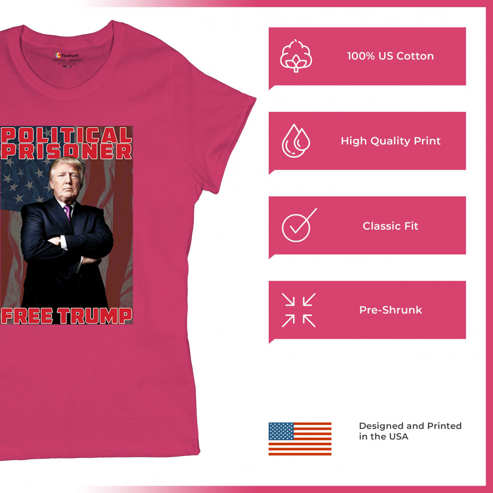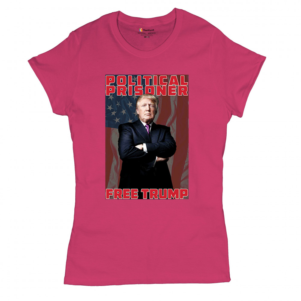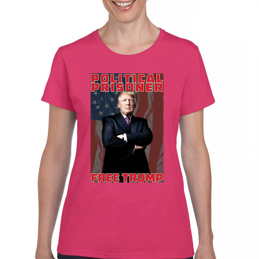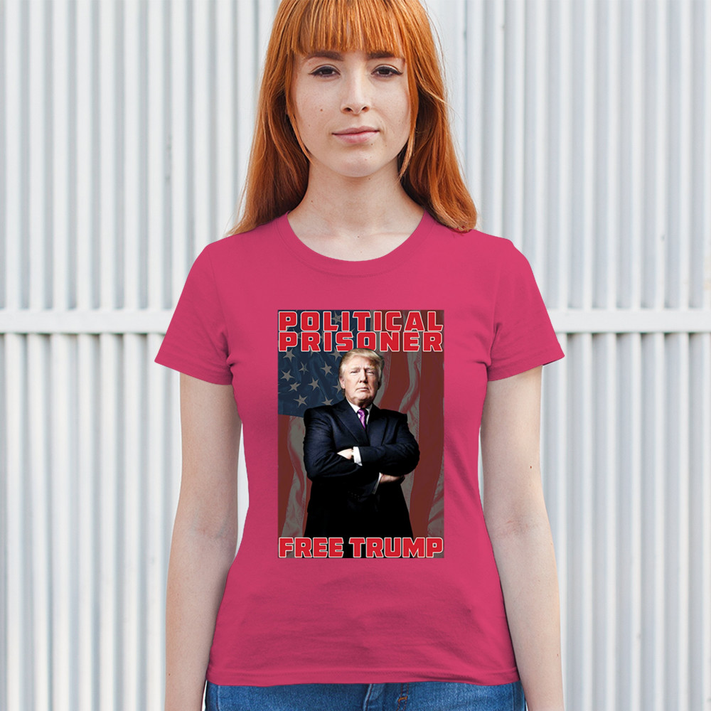 Show your support with the "Political Prisoner Free Trump" design, featuring Trump against an American flag. Perfect for conservative patriots and Trump supporters.