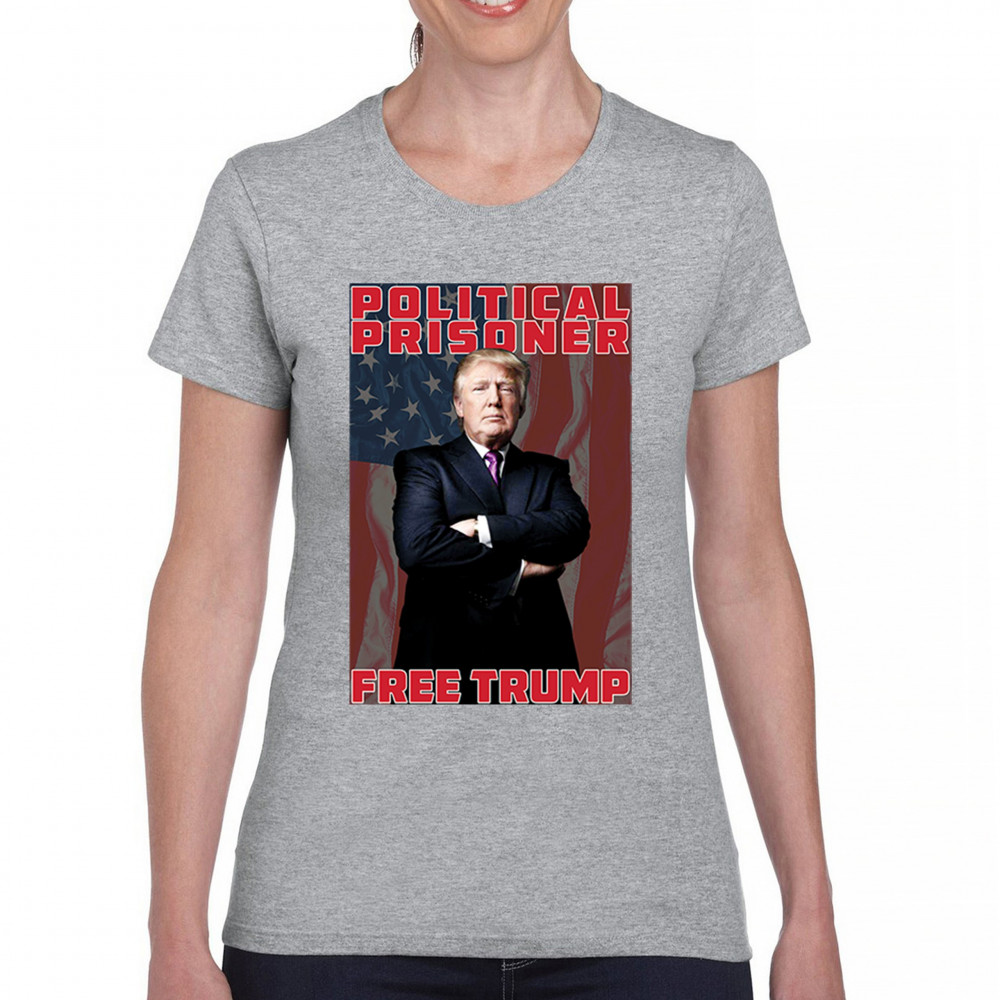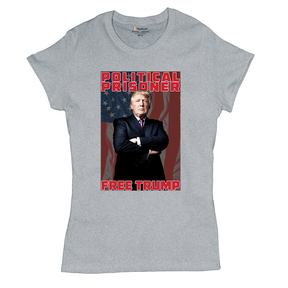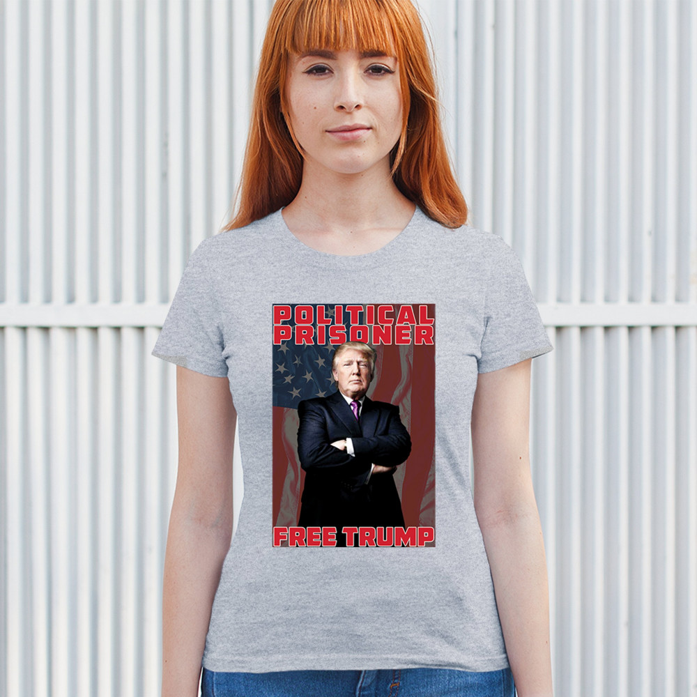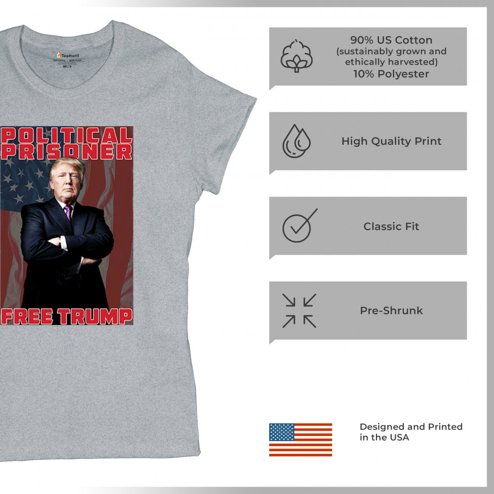 Show your support with the "Political Prisoner Free Trump" design, featuring Trump against an American flag. Perfect for conservative patriots and Trump supporters.